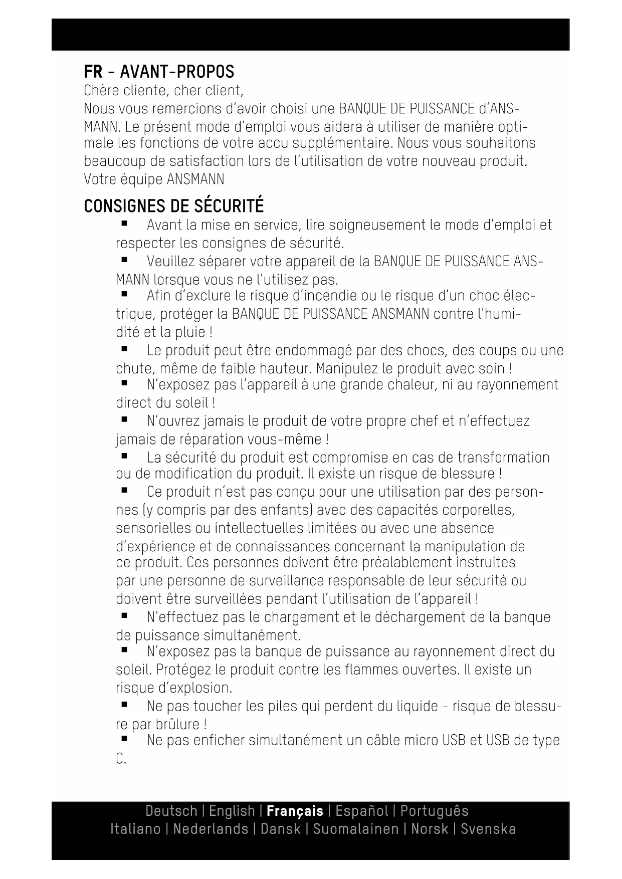 Avant la mise en service, lire soigneusement le mode d‘emploi et respecter les consignes de sécurité. Veuillez séparer votre appareil de la BANQUE DE PUISSANCE ANS- MANN lorsque vous ne l‘utilisez pas. Afin d‘exclure le risque d‘incendie ou le risque d‘un choc élec- trique, protéger la BANQUE DE PUISSANCE ANSMANN contre l‘humi- dité et la pluie ! Le produit peut être endommagé par des chocs, des coups ou une chute, même de faible hauteur. Manipulez le produit avec soin ! N‘exposez pas l‘appareil à une grande chaleur, ni au rayonnement direct du soleil ! N‘ouvrez jamais le produit de votre propre chef et n‘effectuez jamais de réparation vous-même ! La sécurité du produit est compromise en cas de transformation ou de modification du produit. Il existe un risque de blessure ! Ce produit n‘est pas conçu pour une utilisation par des person- nes (y compris par des enfants) avec des capacités corporelles, sensorielles ou intellectuelles limitées ou avec une absence d‘expérience et de connaissances concernant la manipulation de ce produit. Ces personnes doivent être préalablement instruites par une personne de surveillance responsable de leur sécurité ou doivent être surveillées pendant l‘utilisation de l‘appareil ! N’effectuez pas le chargement et le déchargement de la banque de puissance simultanément. N’exposez pas la banque de puissance au rayonnement direct du soleil. Protégez le produit contre les flammes ouvertes. Il existe un risque d’explosion. Ne pas toucher les piles qui perdent du liquide - risque de blessu- re par brûlure ! Ne pas enficher simultanément un câble micro USB et USB de type