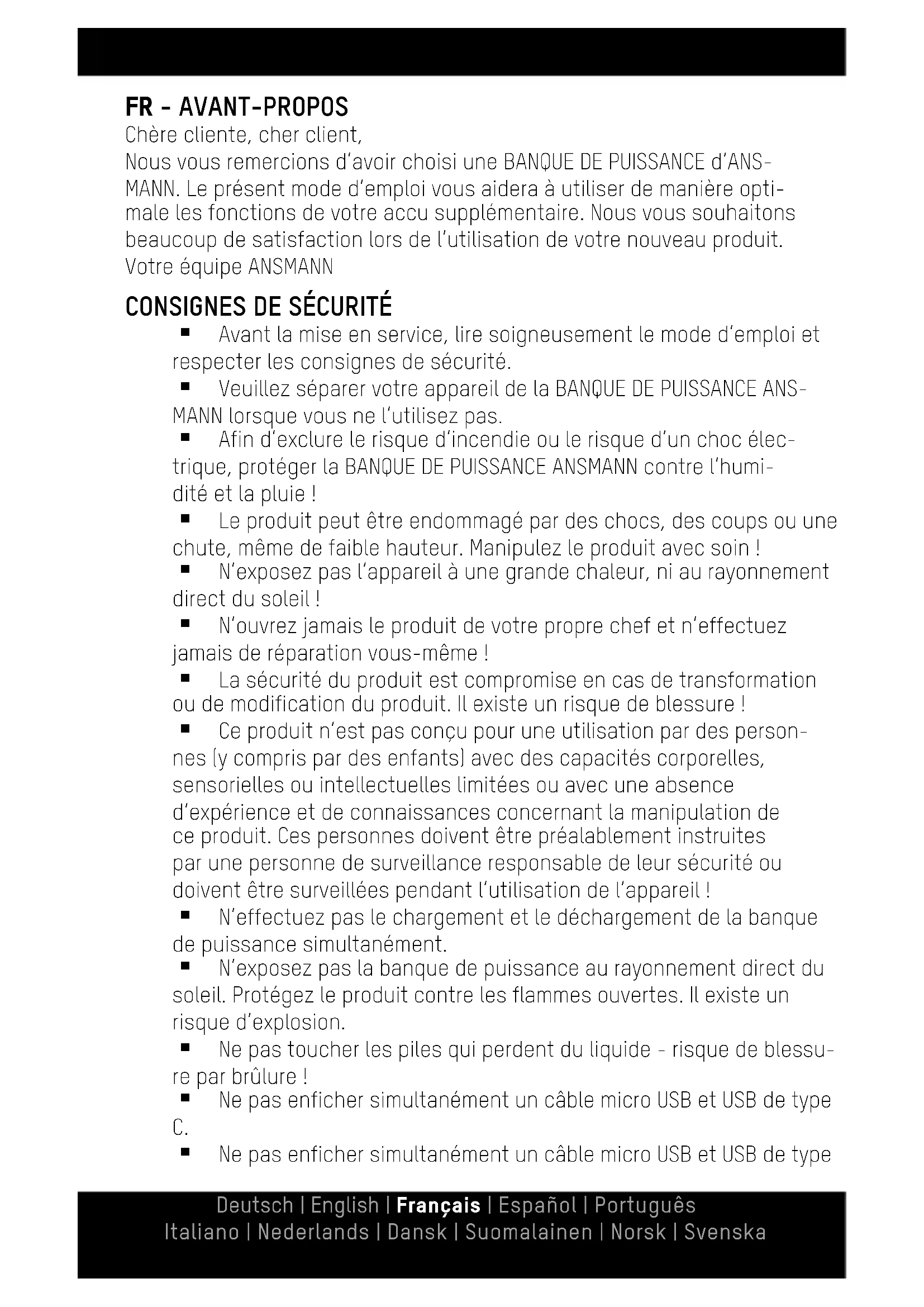 Avant la mise en service, lisez soigneusement le mode d'emploi et respectez les consignes de sécurité. - Veuillez séparer votre appareil de la BANQUE DE PUISSANCE ANS-MANN lorsque vous ne l'utilisez pas. Afin d'exclure le risque d'incendie ou le risque d'un choc électrique, protégez la BANQUE DE PUISSANCE ANSMANN contre l'humidité et la pluie! Le produit peut être endommagé par des chocs, des coups ou une chute, même de faible hauteur. Manipulez le produit avec soin! N'exposez pas l'appareil à une grande chaleur, ni au rayonnement direct du soleil! N'ouvre jamais le produit de votre propre chef et n'effectuez jamais de réparation vous-même! La sécurité du produit est compromise en cas de transformation ou de modification du produit. Il existe un risque de blessure! - Ce produit n'est pas conçu pour une utilisation par des personnes (y compris par des enfants) avec des capacités corporelles, sensorielles ou intellectuelles limitées ou avec une absence d'expérience et de connaissances concernant la manipulation de ce produit. Ces personnes doivent être préalablement instruites par une personne de surveillance responsable de leur sécurité ou doivent être surveillées pendant l'utilisation de l'appareil! N'effectuez pas le chargement et le déchargement de la banque de puissance simultanément. N'exposez pas la banque de puissance au rayonnement direct du soleil. Protégez le produit contre les flammes ouvertes. Il existe un risque d'explosion. - Ne pas toucher les piles qui perdent du liquide - risque de blessure par brûlure ! Ne pas enrichir simultanément un cable micro USB et USB de type C. - Ne pas enrichir simultanément un cable micro USB et USB de type