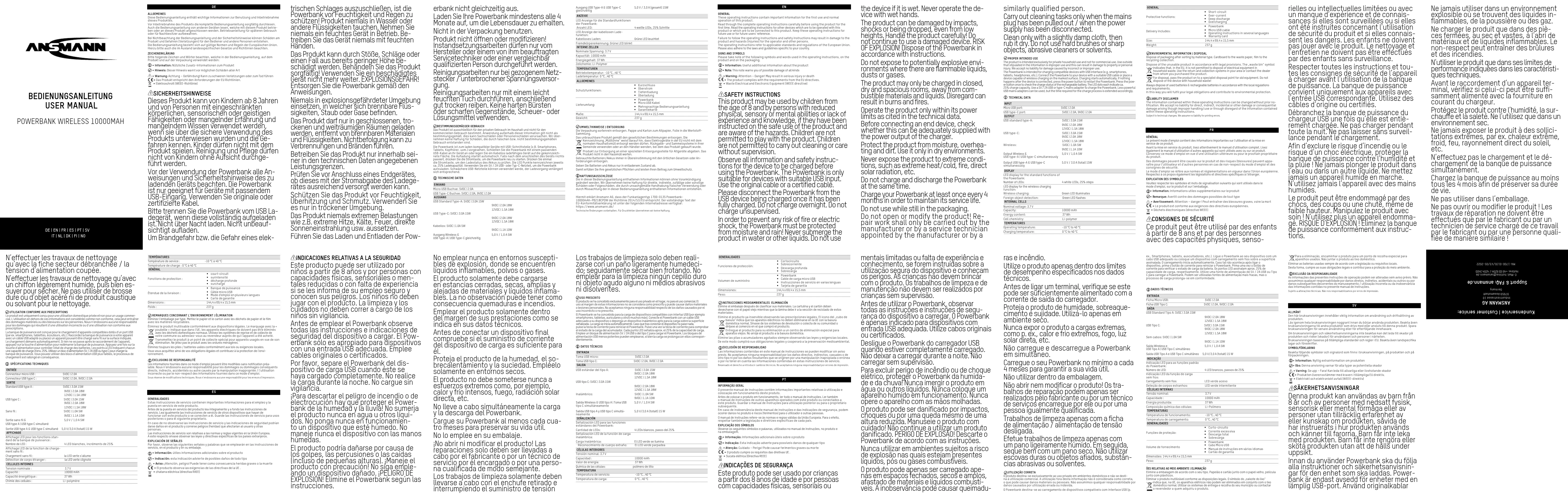 Le produit est uniquement conçu pour une utilisation domestique privée et non pour un usage commer- cial. L’utilisation en dehors de ces informations est considérée comme non conforme, cela peut entraîner des dommages matériels ou des blessures sur les personnes. Nous n’endossons aucune responsabilité pour les dommages qui résultent d’une utilisation incorrecte ou d‘une utilisation non conforme aux prescriptions.La banque de puissance est conçue pour le chargement d’appareils compatibles dotés d’un port USB (par ex. smartphones, tablettes, écouteurs, etc.). Raccordez la banque de puissance à votre appareil avec un câble USB adapté ou placez un appareil pouvant être chargé sans fil sur la surface indiquée. Le chargement démarre automatiquement. Si rien ne se passe après le raccordement de l’appareil, appuyez sur la touche d’alimentation pour redémarrer la banque de puissance. Appuyez une fois sur la touche d’alimentation pour contrôler l’état de charge des batteries. Les points à LED indiquent chacun une capacité de charge d’env. 25%. Utilisez un bloc d’alimentation 5V / 2A USB ou type C pour charger la banque de puissance. Vous pouvez utiliser des blocs d’alimentation USB plus faibles, le processus de chargement est rallongé en conséquence. SPÉCIFICATIONS TECHNIQUES ENTRÉE Connecteur micro USB : 5VDC | 2.0AConnecteur USB type C : 5VDC | 2.0A, 9VDC | 2.0A SORTIE Standard USB type A : 5VDC | 3.0A 15W9VDC | 2.0A 18W12VDC | 1.5A 18WUSB type C : 5VDC | 3.0A 15W9VDC | 2.0A 18W12VDC | 1.5A 18WSans fil : 5VDC | 1.0A 5W9VDC | 1.1A 10WSortie sans fil & USB type A | USB type C simultané5,0 V / 1,0 A 5WSortie USB type A & USB type C simultané 5,0 V/3,0 A (totalt) 15 W AFFICHAGE Affichage LED pour les fonctions stan-dard de la banque de puissance :Nombre de LED : 4 LED blanches, incréments de 25%Affichage LED de la fonction de charge-ment sans fil :Chargement sans fil : la LED verte s’allumeDétection de corps étranger : la LED verte clignote CELLULES INTERNESTension nominale : 3.7 VCapacité : 10000 mAhCapacité énergétique : 37 WhChimie des cellules : Li-polymère TEMPÉRATURES Température de service : -10 °C à 40 °CTempérature de charge : 0 °C à 40 °C GÉNÉRALFonctions de protection : § court-circuit § surintensité § décharge profonde § surcharge Étendue de la livraison : § Banque de puissance § Câble micro USB § Mode d’emploi en plusieurs langues § Carte de garantie Dimensions : 144,4 x 69,4 x 15,5 mmPoids : 237 g REMARQUES CONCERNANT L‘ENVIRONNEMENT | ÉLIMINATIONÉliminez l’emballage par type. Mettez le papier et le carton avec les déchets de papier et le film avec les matières recyclables.Éliminez le produit inutilisable conformément aux dispositions légales. Le marquage avec la « poubelle » indique que dans l’UE, les appareils électriques ne doivent pas être éliminés avec les déchets domestiques normaux. Utilisez les systèmes de reprise et de collecte de votre commune ou adressez-vous au revendeur auprès de qui l’appareil a été acheté.Transmettez le produit à un point de collecte spécial pour appareils usagés en vue de son élimination. Ne jetez pas le produit avec les ordures ménagères.Éliminez toujours les piles / batteries usées conformément aux lois ou exigences locales.Vous vous acquittez ainsi de vos obligations légales et contribuez à la protection de l’envi-ronnement. EXCLUSIONS DE RESPONSABILITÉLes informations fournies dans ce mode d‘emploi peuvent être modifiées sans notification préa-lable. Nous n‘endossons aucune responsabilité pour les dommages ou dommages conséquents directs, indirects, accidentels ou autre causés par la manipulation inappropriée / l’utilisation incorrecte ou par le non-respect des informations fournies dans ce mode d‘emploi. Sous réserve de modifications techniques. Nous n‘endossons aucune responsabilité pour les erreurs d‘impression. GENERALIDADESEstas instrucciones de servicio contienen importantes informaciones para el empleo y la puesta en servicio de este producto.Antes de la puesta en servicio del producto lea íntegramente y a fondo las instrucciones de servicio. Lea igualmente las instrucciones de servicio de otros dispositivos que hayan de funcionar con este producto o se conecten a él. Guarde las instrucciones de servicio para usos posteriores o para el siguiente propietario.En caso de no observarse las instrucciones de servicio y las indicaciones de seguridad podrían darse daños en el producto y correrse peligros (heridas) que afectarían al usuario y otras personas.Las instrucciones de servicio son relativas a las normas y reglas vigentes en la Unión Europea. A este respecto sírvase observar las leyes y directivas específicas de los países extranjeros.EXPLICACIÓN DE SEÑALESPor favor, observe las siguientes señales y palabras que se emplearán en las instrucciones de servicio, en el producto y en su embalaje. = Información: útiles informaciones adicionales sobre el producto = Indicación: esta indicación advierte de posibles daños de todo tipo = Aviso: ¡Atencíón, peligro! Puede tener como consecuencia heridas graves o la muerte = El producto observa las exigencias de las directivas de la UE . = chatarra eléctrica (directiva RAEE)