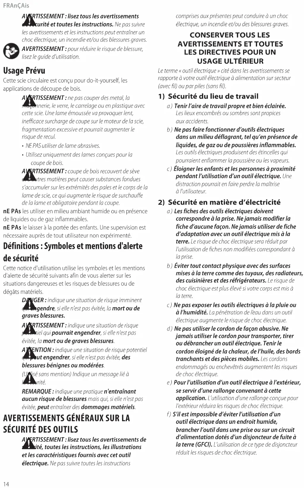 AVERTISSEMENT: lisez tous les avertissements