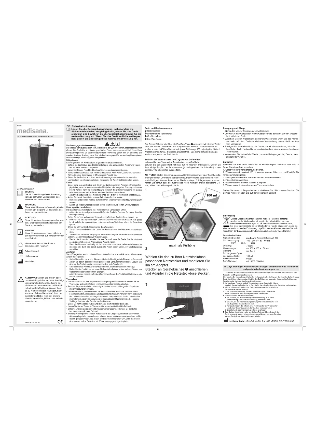 100 ml Maximaal vulniveau 60081 08/2021 Ver. 1.1FR MODE D’EMPLOI Diffuseur de parfum AD 100 Explication des symboles IMPORTANT Le non-respect de ce mode d’emploi peut entraîner des blessures graves ou risque d’endommager l’appareil.AVERTISSEMENT Ces avertissements doivent être respectés pour éviter d’éventuelles blessures à l’utilisateur.ATTENTION Ces instructions doivent être respectées pour éviter d’endommager l’appareil. REMARQUE Ces instructions vous procurent des informations supplémentaires utiles sur l’installation ou le fonctionnement.Utilisez l’appareil uniquement dansdes pièces fermées !Classe de protection II Numéro de LOT Fabricant ATTENTION ! Assurez-vous que l’appareil est utilisé sur une surface résistante à l’humidité sans risque de basculement. Des retombées / dépôts peuvent survenir, en particulier en cas d’utilisation avec une eau riche en minéraux. Veillez à ce que la vapeur émise ne soit pas orientée vers d’autres appareils électriques, des meubles ou des murs. Lisez attentivement le mode d’emploi, en particulier les consignes de sécurité, avant d’utiliser l’appareil et conservez le mode d’emploi pour une utilisation ultérieure. Si vous conez l’appareil à un tiers, veuillez impérativement joindre ce mode d’emploi. FR Consignes de sécurité Appareil et éléments de commande Nébuliseur Couvercle du réservoir amovible Connecteur femelle Touche marche/arrêtLe diffuseur de parfum est s’actionne avec le bouton marche/arrêt . Ce bouton permet d'allumer et d'éteindre le diffuseur de parfum. Il est uniquement possible d’allumer l’appareil si le réservoir d’eau est correctement rempli (capacité de remplissage maximale 100 ml). 100 ml d'eau sufsent pour env. 4 heures de fonctionnement continu. Si le réservoir est vide, le dispositif se met automatiquement hors tension.Remplissage du réservoir d'eau et ajout de parfumsLevez le couvercle du réservoir vers le haut de l'appareil. Remplissez le réservoir d'eau avec 100 ml maximum d'eau potable fraîche. Ajoutez ensuite quelques gouttes de l'essence aromatique (en fonction de l'intensité souhaitée) dans le réservoir d'eau rempli de 100 ml maximum.ATTENTION ! Assurez-vous que l’appareil est utilisé sur une surface résistante à l’humidité sans risque de basculement. Des retombées / dépôts peuvent survenir, en particulier en cas d’utilisation avec une eau riche en minéraux. Veillez à ce que la vapeur émise ne soit pas orientée vers d’autres appareils électriques, des meubles ou des murs. Nettoyage et maintenance• Débranchez le cordon d'alimentation avant chaque nettoyage.• Videz l’appareil après chaque utilisation et séchez le réservoir d’eau avec un chiffon.• Lavez le réservoir d’eau à l’eau claire lorsque vous souhaitez changer de parfum. Cela évitera que les différents parfums se mélangent.• Nettoyez la surface extérieure de l’appareil uniquement à l’aide d’un chiffon doux légèrement humidié. Séchez-le ensuite en l’essuyant avec un chiffon doux et sec.• N’utilisez jamais des brosses, des détergents agressifs, de l’essence, des solvants ou de l’alcool.DétartrageDétartrez l’appareil toutes les cinq à six utilisations ou tous les 14 jours. Pour ce faire, procédez comme suit :1. Débranchez l’appareil de la source d’alimentation électrique.2. Remplissez le réservoir d’eau avec un maximum de 100 ml d’eau chaude et trois cuillères à soupe d’acide citrique.3. Laissez agir le liquide pendant quinze minutes.4. Videz le liquide.5. Rincez le réservoir d’eau à l’eau fraîche. 6. Essuyez le réservoir d’eau à l’aide d’un chiffon sec.Pour toute question, veuillez contacter notre service clientèle. L’adresse du service se trouve sur la feuille séparée ci-jointe.Mise au rebutCet appareil ne doit pas être jeté avec les ordures ménagères. Tout consommateur se trouve dans l’obligation de déposer tout appareil électrique ou électronique, que celui-ci contienne des produits nocifs ou non, dans un centre de collecte de sa ville ou à un point de vente, an que celui-ci puisse être éliminé selon un processus écologique. Adressez-vous aux autorités locales ou à votre revendeur pour la mise au rebut.Caractéristiques techniquesNom et modèle : Alimentation électrique : 24 V 0,5 APuissance : Dimensions : Poids : Contenancedu réservoir d'eau : Référence : Numéro EAN : medisana Diffuseur de parfum AD 100100 - 240 V~, 50 - 60 Hz7 Wattsenv. 103 x 103 x 174 mmenv. 427 g100 ml6008140 15588 60081 4Vous pouvez consulter la version actuelle de ce mode d’emploi à l’adresse suivante : www.medisana.comPar souci d’amélioration constante de nos produits, nous nous réservons le droit d’effectuer des modications techniques et conceptuelles.Conditions de garantie et de réparationEn cas de réclamation au titre de la garantie, veuillez vous adresser à votre magasin spécialisé ou directement au service après-vente. Si vous devez retourner l’appareil, veuillez indiquer le défaut et joindre une copie du justicatif d’achat. Les conditions de garantie suivantes sont applicables :1. Les produits medisana sont garantis 3 ans à compter de la date d’achat. En cas de réclamation au titre de la garantie, la date de vente doit être prouvée par une quittance d’achat ou une facture.