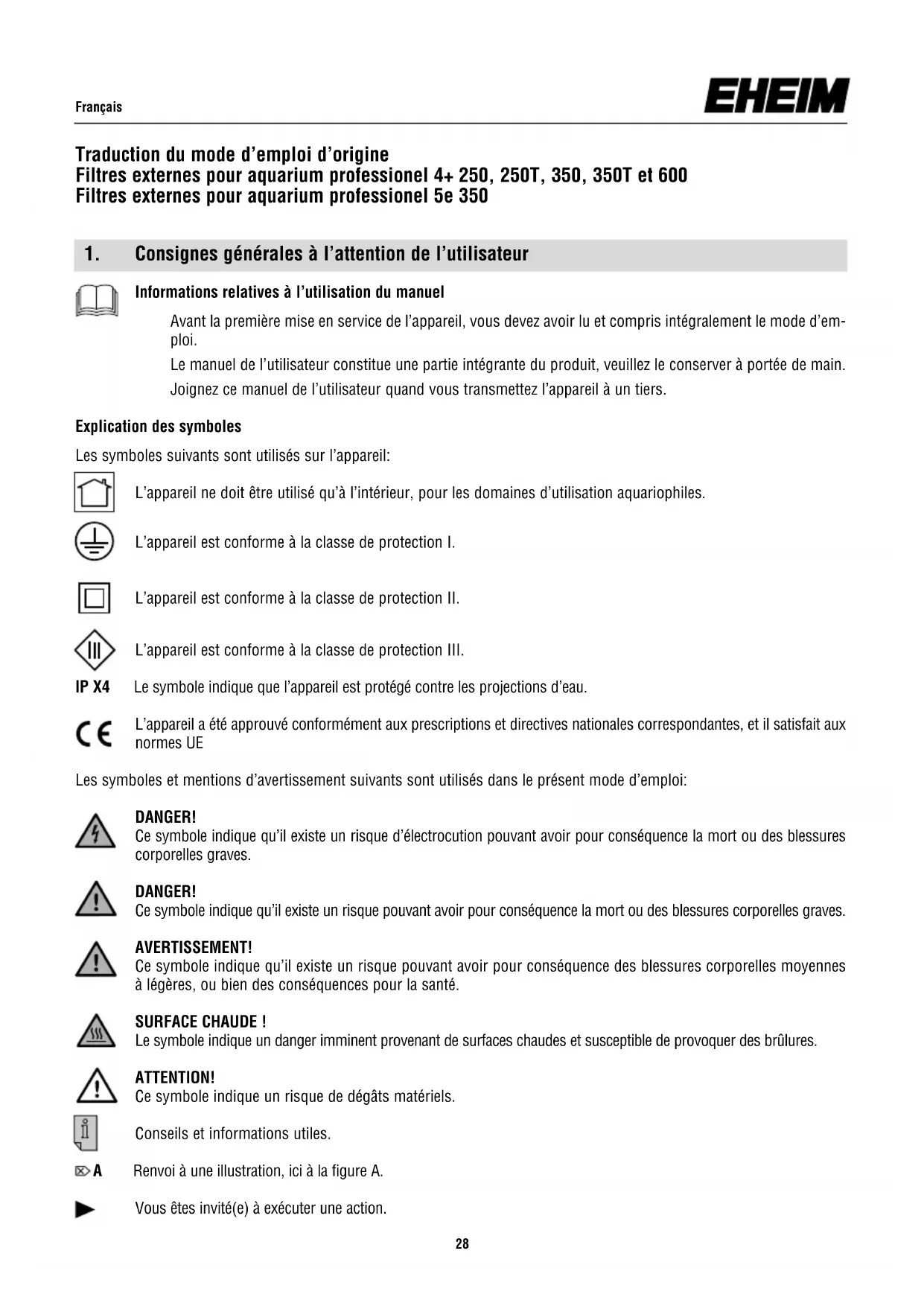 L’appareil est conforme à la classe de protection II. L’appareil est conforme à la classe de protection III. IP X4 Le symbole indique que l’appareil est protégé contre les projections d’eau. L’appareil a été approuvé conformément aux prescriptions et directives nationales correspondantes, et il satisfait aux normes UE Les symboles et mentions d’avertissement suivants sont utilisés dans le présent mode d’emploi: DANGER! Ce symbole indique qu’il existe un risque d’électrocution pouvant avoir pour conséquence la mort ou des blessures corporelles graves. DANGER! Ce symbole indique qu’il existe un risque pouvant avoir pour conséquence la mort ou des blessures corporelles graves. AVERTISSEMENT! Ce symbole indique qu’il existe un risque pouvant avoir pour conséquence des blessures corporelles moyennes à légères, ou bien des conséquences pour la santé. SURFACE CHAUDE ! Le symbole indique un danger imminent provenant de surfaces chaudes et susceptible de provoquer des brûlures. ATTENTION! Ce symbole indique un risque de dégâts matériels. Conseils et informations utiles. A Renvoi à une illustration, ici à la figure A. Vous êtes invité(e) à exécuter une action. Traduction du mode d’emploi d’origine Filtres externes pour aquarium professionel 4+ 250, 250T, 350, 350T et 600 Filtres externes pour aquarium professionel 5e 350 28Français