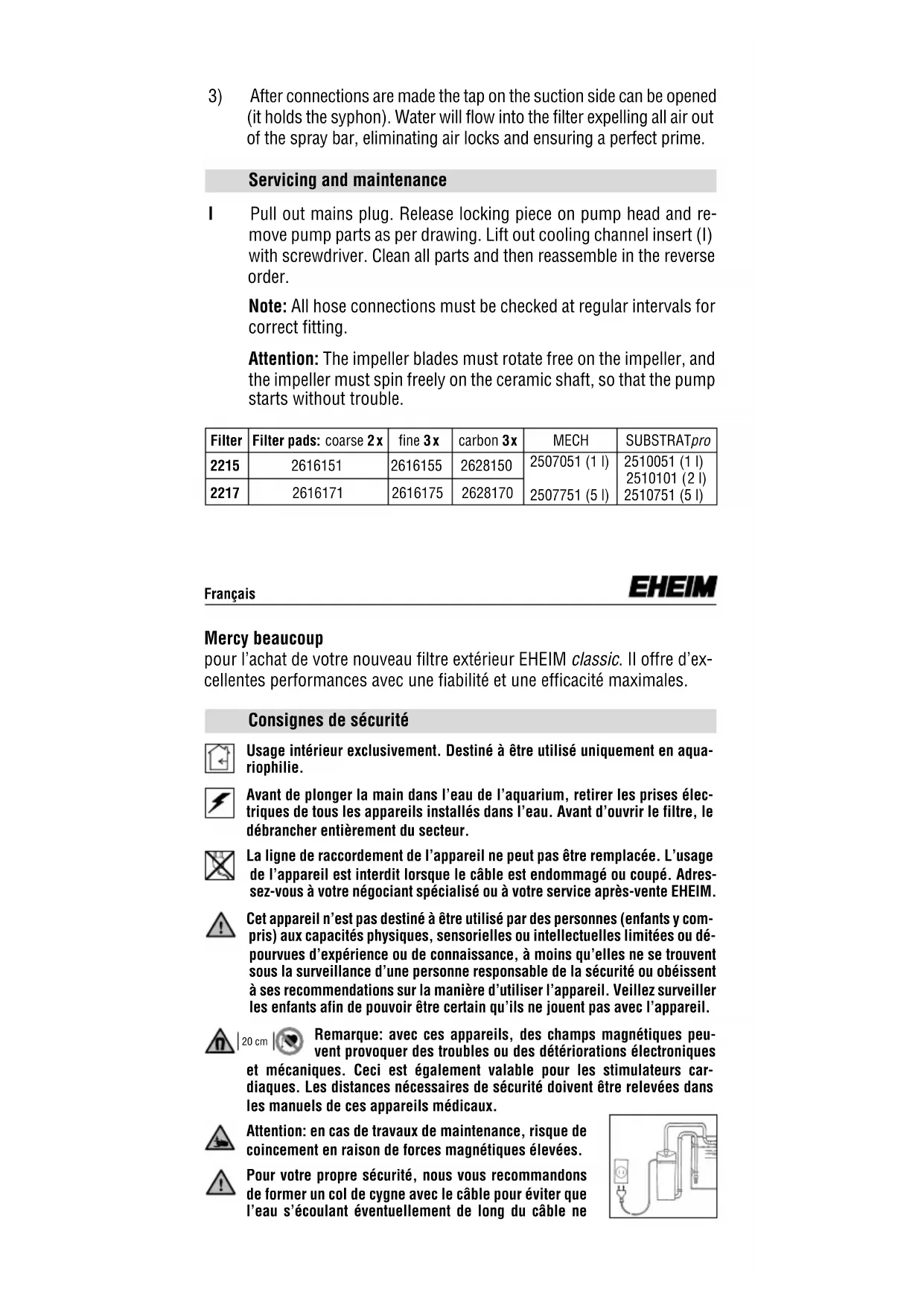 (it holds the syphon). Water will flow into the filter expelling all air out of the spray bar, eliminating air locks and ensuring a perfect prime. Français Mercy beaucoup pour l’achat de votre nouveau filtre extérieur EHEIM classic. Il offre d’ex- cellentes performances avec une fiabilité et une efficacité maximales. Consignes de sécurité Usage intérieur exclusivement. Destiné à être utilisé uniquement en aqua- riophilie. Avant de plonger la main dans l’eau de l’aquarium, retirer les prises élec- triques de tous les appareils installés dans l’eau. Avant d’ouvrir le filtre, le débrancher entièrement du secteur. La ligne de raccordement de l’appareil ne peut pas être remplacée. L’usage de l’appareil est interdit lorsque le câble est endommagé ou coupé. Adres- sez-vous à votre négociant spécialisé ou à votre service après-vente EHEIM. Cet appareil n’est pas destiné à être utilisé par des personnes (enfants y com- pris) aux capacités physiques, sensorielles ou intellectuelles limitées ou dé- pourvues d’expérience ou de connaissance, à moins qu’elles ne se trouvent sous la surveillance d’une personne responsable de la sécurité ou obéissent à ses recommendations sur la manière d’utiliser l’appareil. Veillez surveiller les enfants afin de pouvoir être certain qu’ils ne jouent pas avec l’appareil. Remarque: avec ces appareils, des champs magnétiques peu- vent provoquer des troubles ou des détériorations électroniques et mécaniques. Ceci est également valable pour les stimulateurs car- diaques. Les distances nécessaires de sécurité doivent être relevées dans les manuels de ces appareils médicaux. Attention: en cas de travaux de maintenance, risque de coincement en raison de forces magnétiques élevées. Pour votre propre sécurité, nous vous recommandons de former un col de cygne avec le câble pour éviter que l’eau s’écoulant éventuellement de long du câble ne 20 cmFiltre extérieur 2215 / 2217 Fonction