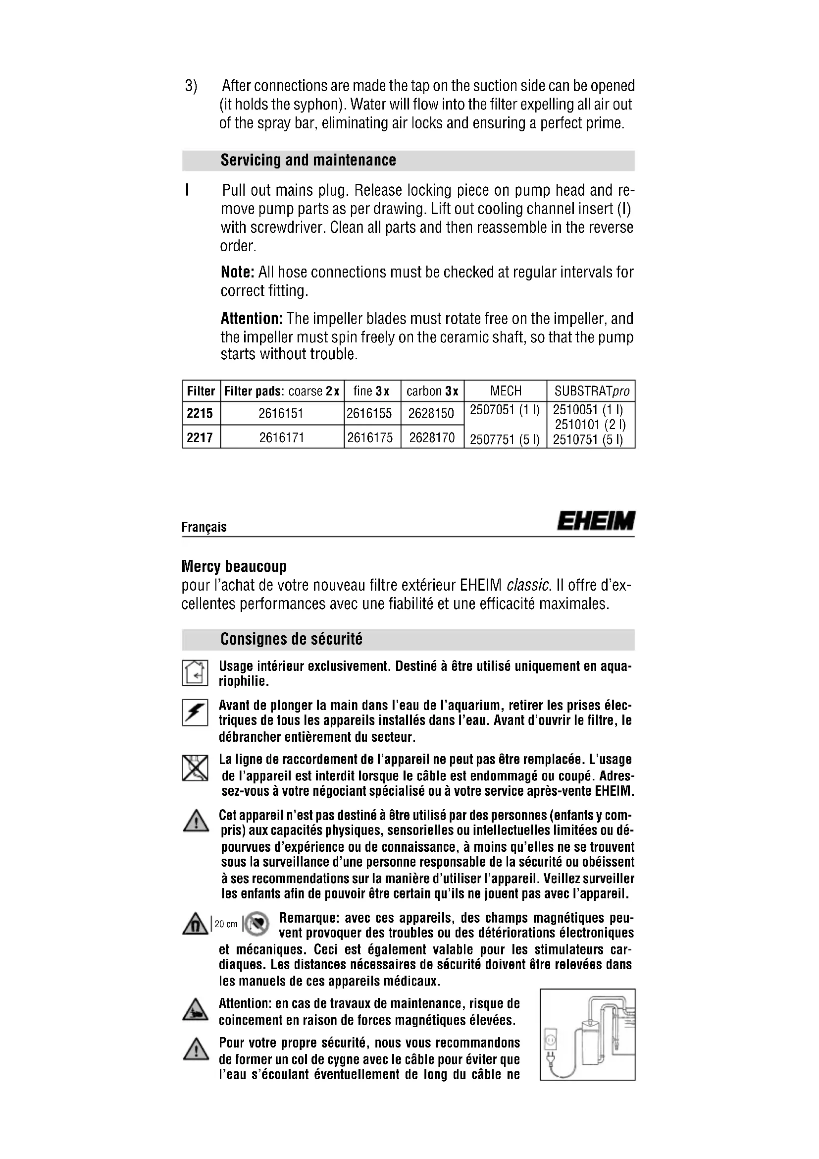 (it holds the syphon). Water will flow into the filter expelling all air out of the spray bar, eliminating air locks and ensuring a perfect prime. Français Mercy beaucoup pour l’achat de votre nouveau filtre extérieur EHEIM classic. Il offre d’ex- cellentes performances avec une fiabilité et une efficacité maximales. Consignes de sécurité Usage intérieur exclusivement. Destiné à être utilisé uniquement en aqua- riophilie. Avant de plonger la main dans l’eau de l’aquarium, retirer les prises élec- triques de tous les appareils installés dans l’eau. Avant d’ouvrir le filtre, le débrancher entièrement du secteur. La ligne de raccordement de l’appareil ne peut pas être remplacée. L’usage de l’appareil est interdit lorsque le câble est endommagé ou coupé. Adres- sez-vous à votre négociant spécialisé ou à votre service après-vente EHEIM. Cet appareil n’est pas destiné à être utilisé par des personnes (enfants y com- pris) aux capacités physiques, sensorielles ou intellectuelles limitées ou dé- pourvues d’expérience ou de connaissance, à moins qu’elles ne se trouvent sous la surveillance d’une personne responsable de la sécurité ou obéissent à ses recommendations sur la manière d’utiliser l’appareil. Veillez surveiller les enfants afin de pouvoir être certain qu’ils ne jouent pas avec l’appareil. Remarque: avec ces appareils, des champs magnétiques peu- vent provoquer des troubles ou des détériorations électroniques et mécaniques. Ceci est également valable pour les stimulateurs car- diaques. Les distances nécessaires de sécurité doivent être relevées dans les manuels de ces appareils médicaux. Attention: en cas de travaux de maintenance, risque de coincement en raison de forces magnétiques élevées. Pour votre propre sécurité, nous vous recommandons de former un col de cygne avec le câble pour éviter que l’eau s’écoulant éventuellement de long du câble ne 20 cmFiltre extérieur 2215 / 2217 Fonction