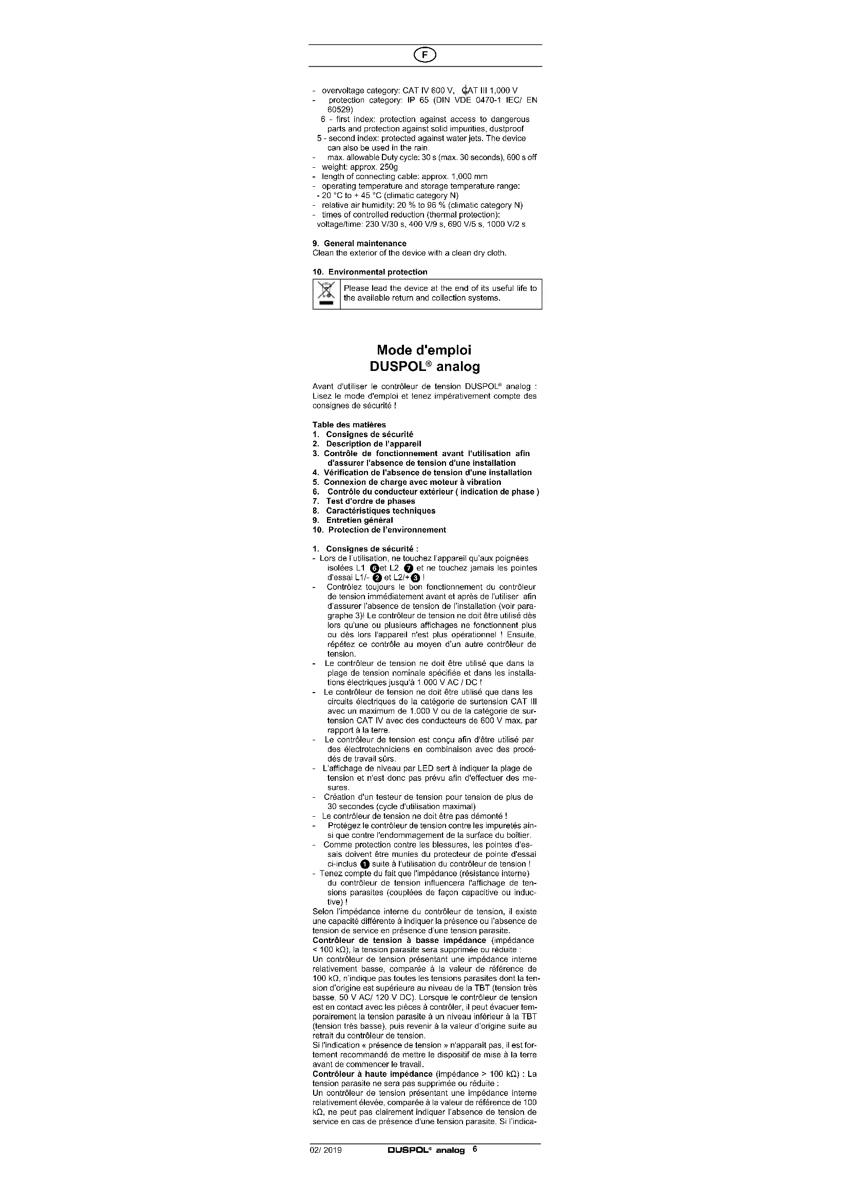 suite à l'utilisation du contrôleur de tension ! - Tenez compte du fait que l'impédance (résistance interne) du contrôleur de tension influencera l'affichage de ten- sions parasites (couplées de façon capacitive ou induc- tive) ! Selon l’impédance interne du contrôleur de tension, il existe une capacité différente à indiquer la présence ou l’absence de tension de service en présence d’une tension parasite. Contrôleur de tension à basse impédance (impédance < 100 kΩ), la tension parasite sera supprimée ou réduite : Un contrôleur de tension présentant une impédance interne relativement basse, comparée à la valeur de référence de 100 kΩ, n’indique pas toutes les tensions parasites dont la ten- sion d’origine est supérieure au niveau de la TBT (tension très basse, 50 V AC/ 120 V DC). Lorsque le contrôleur de tension est en contact avec les pièces à contrôler, il peut évacuer tem- porairement la tension parasite à un niveau inférieur à la TBT (tension très basse), puis revenir à la valeur d’origine suite au retrait du contrôleur de tension. Si l'indication « présence de tension » n'apparaît pas, il est for- tement recommandé de mettre le dispositif de mise à la terre avant de commencer le travail. Contrôleur à haute impédance (impédance > 100 kΩ) : La tension parasite ne sera pas supprimée ou réduite : Un contrôleur de tension présentant une impédance interne relativement élevée, comparée à la valeur de référence de 100 kΩ, ne peut pas clairement indiquer l’absence de tension de service en cas de présence d'une tension parasite. Si l’indica-02/ 2019 DUSPOL