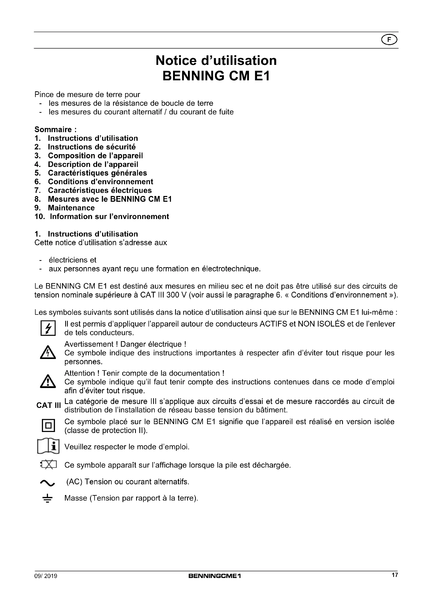 Pince de mesure de terre pour - les mesures de la résistance de boucle de terre - les mesures du courant alternatif / du courant de fuiteSommaire :1. Instructions d’utilisation2. Instructions de sécurité3. Composition de l’appareil4. Description de l’appareil5. Caractéristiques générales6. Conditions d’environnement7. Caractéristiques électriques8. Mesures avec le BENNING CM E19. Maintenance10. Information sur l’environnement1. Instructions d’utilisationCette notice d’utilisation s’adresse aux - électriciens et - aux personnes ayant reçu une formation en électrotechnique.Le BENNING CM E1 est destiné aux mesures en milieu sec et ne doit pas être utilisé sur des circuits de tension nominale supérieure à CAT III 300 V (voir aussi le paragraphe 6. « Conditions d’environnement »).Les symboles suivants sont utilisés dans la notice d’utilisation ainsi que sur le BENNING CM E1 lui-même : Il est permis d’appliquer l’appareil autour de conducteurs ACTIFS et NON ISOLÉS et de l’enlever de tels conducteurs. Avertissement ! Danger électrique !Ce symbole indique des instructions importantes à respecter afin d’éviter tout risque pour les personnes. Attention ! Tenir compte de la documentation !Ce symbole indique qu’il faut tenir compte des instructions contenues dans ce mode d’emploi afin d’éviter tout risque.CAT IIILa catégorie de mesure III s’applique aux circuits d’essai et de mesure raccordés au circuit de distribution de l’installation de réseau basse tension du bâtiment. Ce symbole placé sur le BENNING CM E1 signifie que l’appareil est réalisé en version isolée (classe de protection II).Veuillez respecter le mode d’emploi.Ce symbole apparaît sur l’affichage lorsque la pile est déchargée. (AC) Tension ou courant alternatifs. Masse (Tension par rapport à la terre).09/ 2019