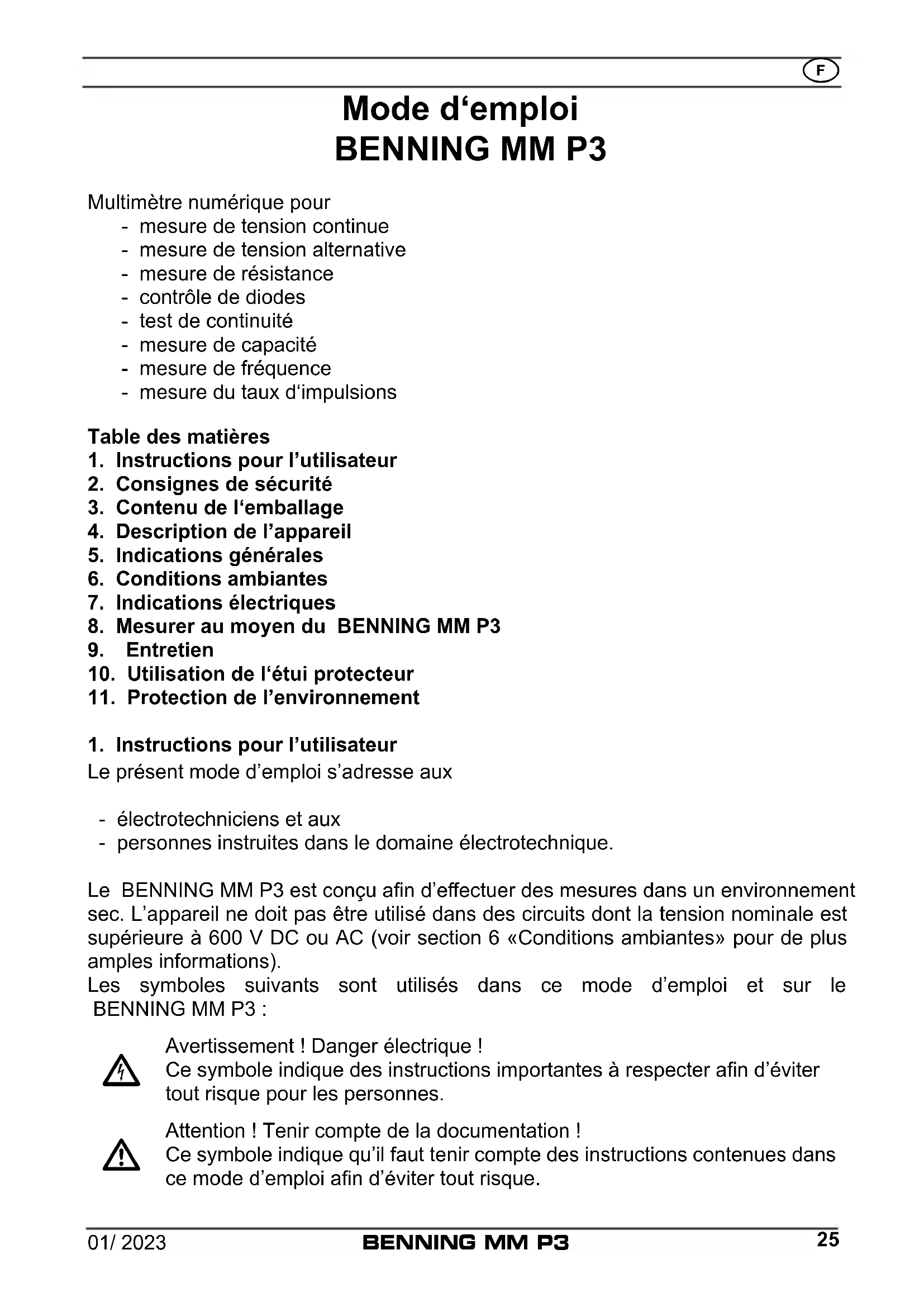 Le présent mode d’emploi s’adresse aux - électrotechniciens et aux - personnes instruites dans le domaine électrotechnique. Le BENNING MM P3 est conçu an d’eectuer des mesures dans un environnement sec. L’appareil ne doit pas être utilisé dans des circuits dont la tension nominale est supérieure à 600 V DC ou AC (voir section 6 «Conditions ambiantes» pour de plus amples informations). Les symboles suivants sont utilisés dans ce mode d’emploi et sur le BENNING MM P3 :