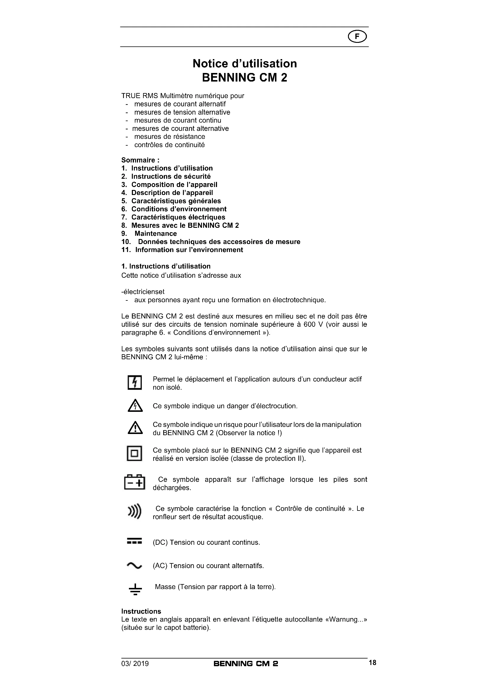 Une fois le produit en fin de vie, veuillez le déposer dans un point de recyclage approprié.03/ 2019 BENNING CM 2