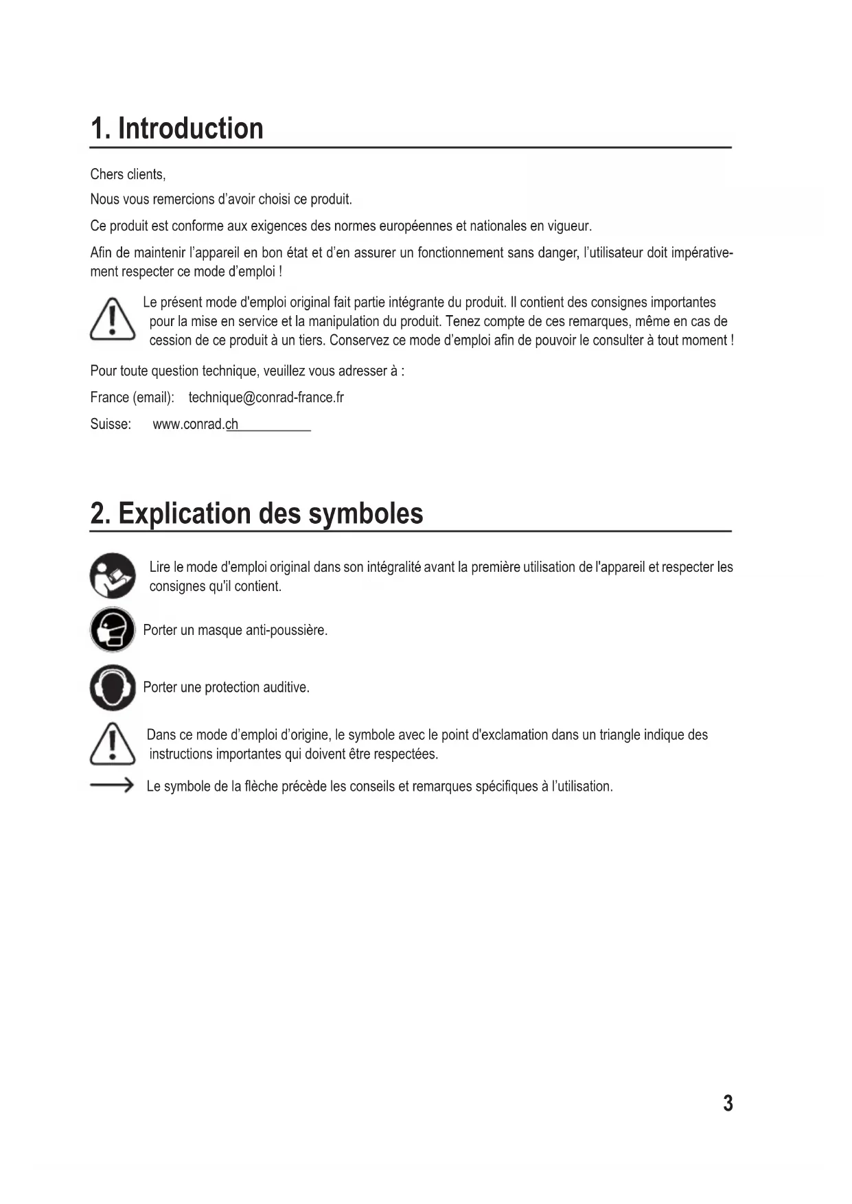 Chersclients, Nousvousremercionsd’avoirchoisiceproduit. Ce produit est conforme aux exigences des normes européennes et nationales en vigueur. Andemaintenirl’appareilenbonétatetd’enassurerunfonctionnementsansdanger,l’utilisateurdoitimpérative- ment respecter ce mode d’emploi ! Le présent mode d'emploi original fait partie intégrante du produit. Il contient des consignes importantes pourlamiseenserviceetlamanipulationduproduit.Tenezcomptedecesremarques,mêmeencasde cessiondeceproduitàuntiers.Conservezcemoded’emploiandepouvoirleconsulteràtoutmoment! Pourtoutequestiontechnique,veuillezvousadresserà: France(email): technique@conrad-france.fr Suisse: www.conrad.ch