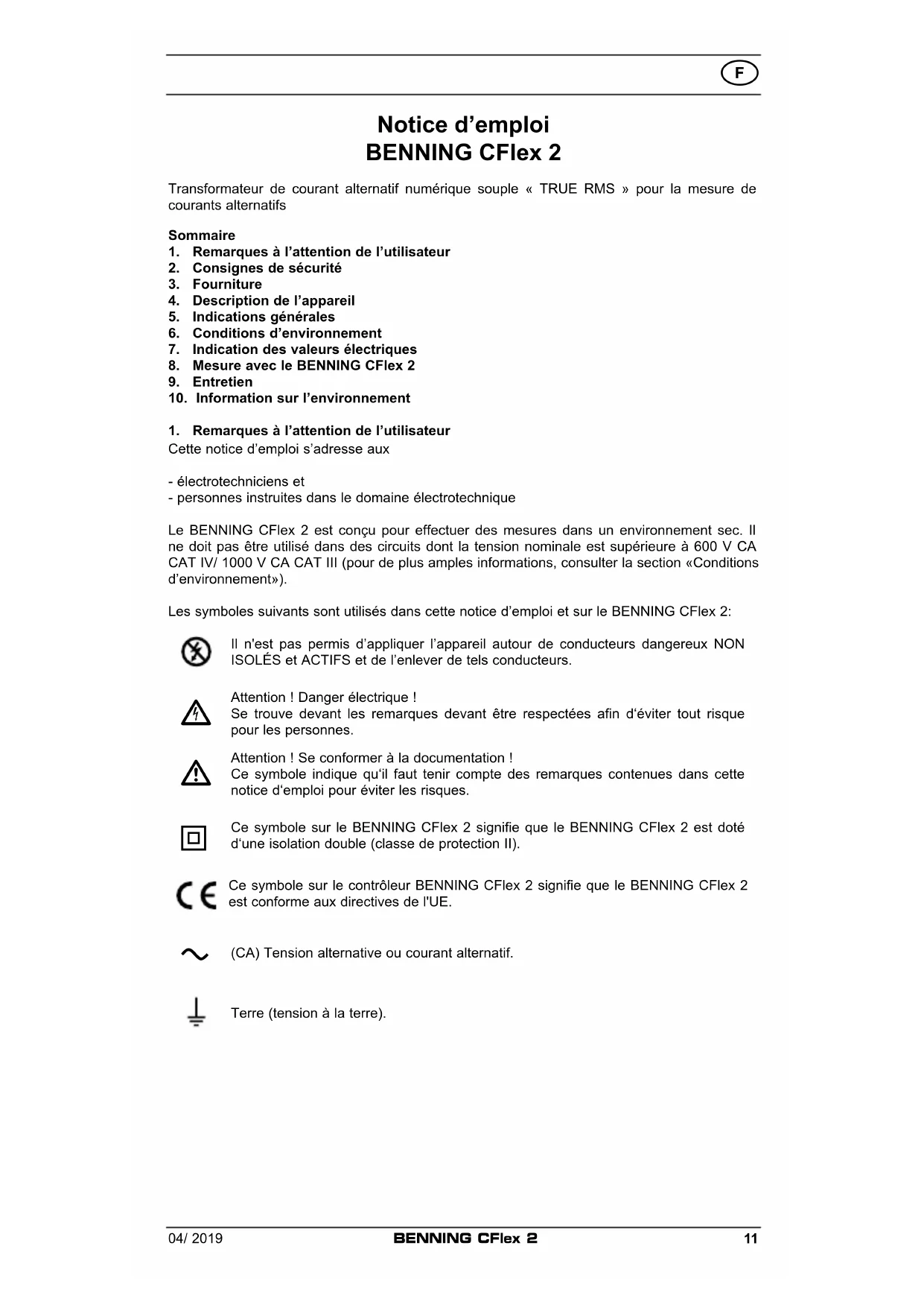 Notice d’emploi BENNING CFlex 2 Transformateur de courant alternatif numérique souple « TRUE RMS » pour la mesure de courants alternatifsSommaire1. Remarques à l’attention de l’utilisateur2. Consignes de sécurité3. Fourniture4. Description de l’appareil5. Indications générales6. Conditions d’environnement7. Indication des valeurs électriques8. Mesure avec le BENNING CFlex 29. Entretien10. Information sur l’environnement1. Remarques à l’attention de l’utilisateurCette notice d’emploi s’adresse aux- électrotechniciens et- personnes instruites dans le domaine électrotechniqueLe BENNING CFlex 2 est conçu pour effectuer des mesures dans un environnement sec. Il ne doit pas être utilisé dans des circuits dont la tension nominale est supérieure à 600 V CA CAT IV/ 1000 V CA CAT III (pour de plus amples informations, consulter la section «Conditions d’environnement»).Les symboles suivants sont utilisés dans cette notice d’emploi et sur le BENNING CFlex 2:Il n'est pas permis d’appliquer l’appareil autour de conducteurs dangereux NON ISOLÉS et ACTIFS et de l’enlever de tels conducteurs. Attention ! Danger électrique !Se trouve devant les remarques devant être respectées afin d‘éviter tout risque pour les personnes. Attention ! Se conformer à la documentation !Ce symbole indique qu‘il faut tenir compte des remarques contenues dans cette notice d‘emploi pour éviter les risques. Ce symbole sur le BENNING CFlex 2 signifie que le BENNING CFlex 2 est doté d‘une isolation double (classe de protection II).Ce symbole sur le contrôleur BENNING CFlex 2 signifie que le BENNING CFlex 2 est conforme aux directives de l'UE. (CA) Tension alternative ou courant alternatif.Terre (tension à la terre).04/ 2019 BENNING CFlex 2