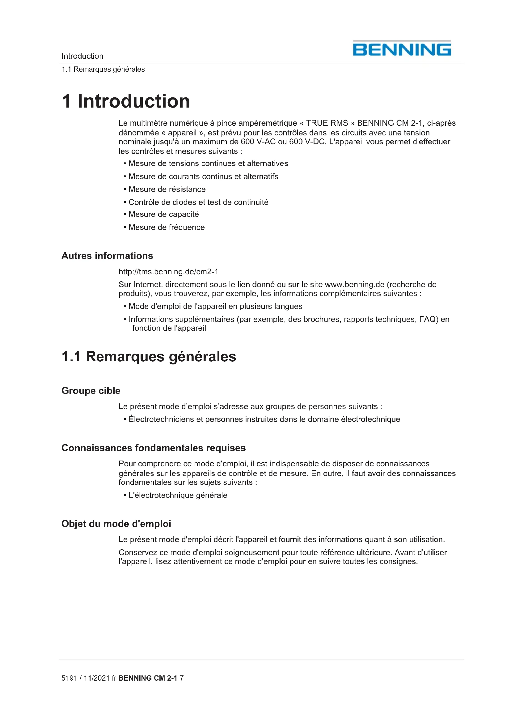 - L'électrotechnique générale Objet du mode d'emploi Le présent mode d'emploi décrit l'appareil et fournit des informations quant à son utilisation. Conservez ce mode d'emploi soigneusement pour toute référence ultérieure. Avant d'utiliser l'appareil, lisez attentivement ce mode d'emploi pour en suivre toutes les consignes.1.2 Historique Introduction 5191 / 11/2021 frBENNING CM 2-18 REMARQUE Exclusion de responsabilité Assurez-vous que toute personne utilisant l'appareil a bien lu et compris le présent mode d'emploi avant de travailler avec l'appareil et qu'elle en respecte le contenu en tous points. Le non-respect du mode d'emploi peut entraîner des dommages sur le produit ainsi que des dommages matériels et/ou corporels. BENNING décline toute responsabilité pour les dommages et dysfonctionnements résultant du non-respect du mode d'emploi. Les appareils font l'objet d'un développement continu. BENNING se réserve le droit de toute modification de forme, d'équipement et de technique. Les informations contenues dans ce mode d'emploi sont conformes à l'état actuel technique au moment de l'impression. Par conséquent, aucune revendication quant à des propriétés particulières de l'appareil ne saurait être déduite du contenu du présent mode d'emploi. Toute information contenue dans le présent mode d'emploi peut être modifiée à tout moment sans préavis préalable. BENNING n'est pas tenue de compléter ni de tenir à jour les indications figurant dans le présent mode d'emploi. Pour toute question d'ordre technique, veuillez contacter l' Assistance technique [}page9]. Marques déposées Toutes les marques déposées, même si celles-ci ne sont pas spécifiquement signalées, sont la propriété de leurs propriétaires respectifs et sont reconnues.