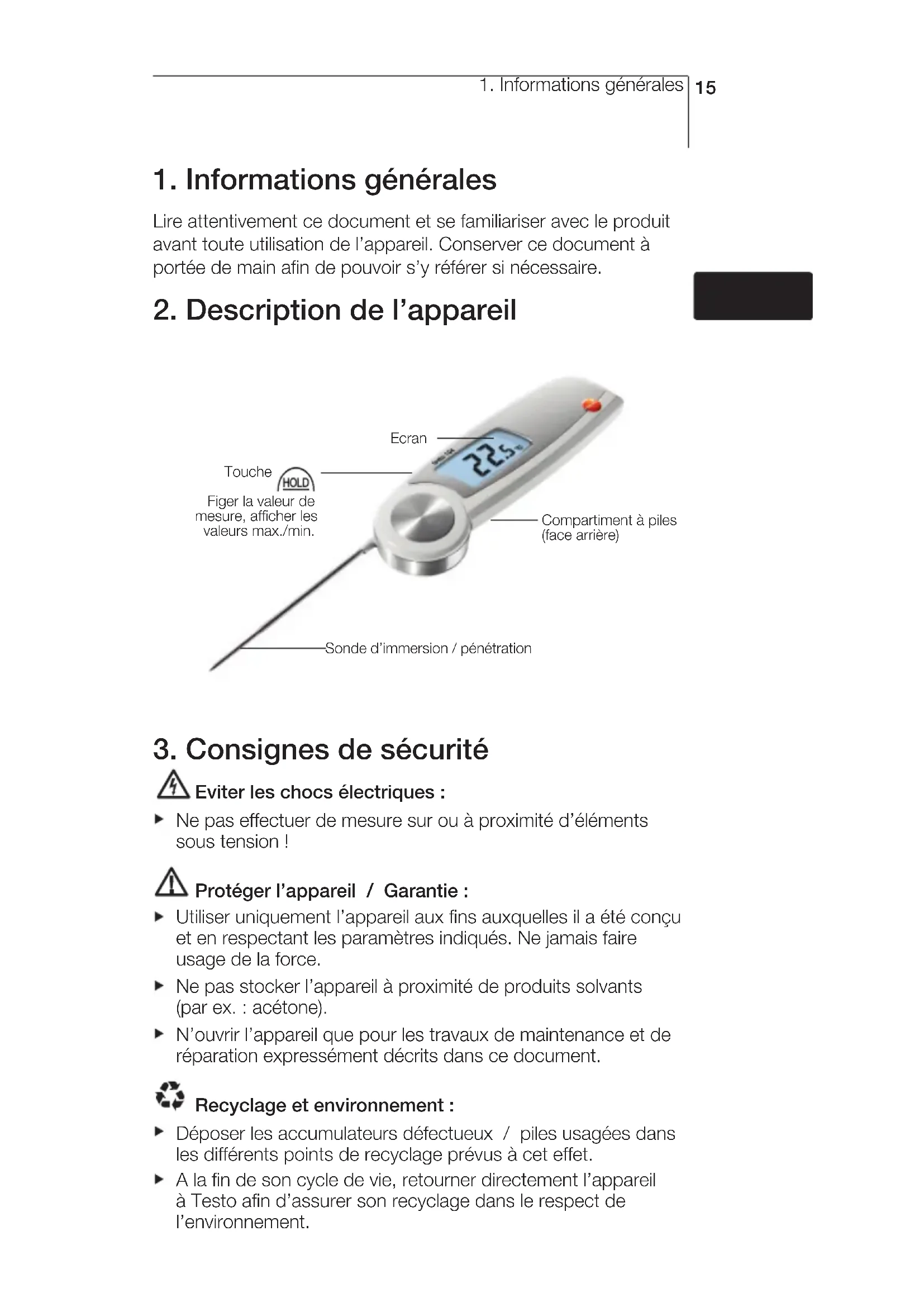 Eviter les chocs électriques : Ne pas effectuer de mesure sur ou à proximité d’éléments sous tension ! Protéger l’appareil / Garantie : Utiliser uniquement l’appareil aux fins auxquelles il a été conçu et en respectant les paramètres indiqués. Ne jamais faire usage de la force. Ne pas stocker l’appareil à proximité de produits solvants (par ex. : acétone). N’ouvrir l’appareil que pour les travaux de maintenance et de réparation expressément décrits dans ce document. Recyclage et environnement : Déposer les accumulateurs défectueux / piles usagées dans les différents points de recyclage prévus à cet effet. A la fin de son cycle de vie, retourner directement l’appareil à Testo afin d’assurer son recyclage dans le respect de l’environnement. enfresitptsvnl???? Touche Figer la valeur de mesure, afficher les valeurs max./min. Compartiment à piles (face arrière) Ecran Sonde d’immersion / pénétration1616 4. Utilisation conforme