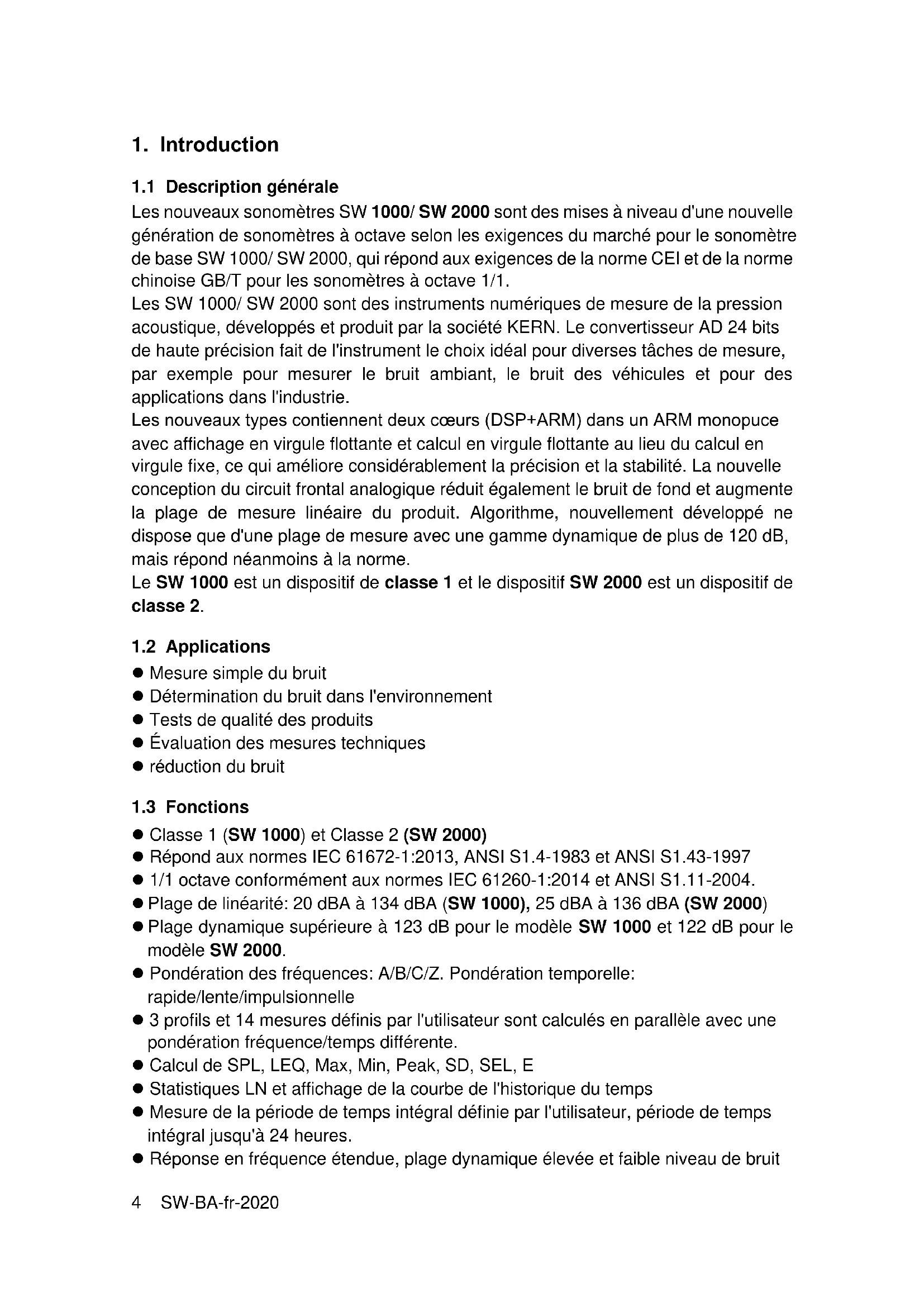 ⚫ Classe 1 (SW 1000) et Classe 2 (SW 2000) ⚫ Répond aux normes IEC 61672-1:2013, ANSI S1.4-1983 et ANSI S1.43-1997 ⚫ 1/1 octave conformément aux normes IEC 61260-1:2014 et ANSI S1.11-2004. ⚫ Plage de linéarité: 20 dBA à 134 dBA (SW 1000), 25 dBA à 136 dBA (SW 2000) ⚫ Plage dynamique supérieure à 123 dB pour le modèle SW 1000 et 122 dB pour le modèle SW 2000. ⚫ Pondération des fréquences: A/B/C/Z. Pondération temporelle: rapide/lente/impulsionnelle ⚫ 3 profils et 14 mesures définis par l'utilisateur sont calculés en parallèle avec une pondération fréquence/temps différente. ⚫ Calcul de SPL, LEQ, Max, Min, Peak, SD, SEL, E ⚫ Statistiques LN et affichage de la courbe de l'historique du temps ⚫ Mesure de la période de temps intégral définie par l'utilisateur, période de temps intégral jusqu'à 24 heures. ⚫ Réponse en fréquence étendue, plage dynamique élevée et faible niveau de bruitSW-BA-fr-2020 SW-BA-fr-20205 grâce à un noyau ARM haute vitesse avec unité à virgule flottante. ⚫ Carte micro SD 4G (carte TF) comme dispositif de stockage de masse ⚫ Port de commande à distance RS-232 ⚫ Module GPS interne (option), support de l'heure GPS