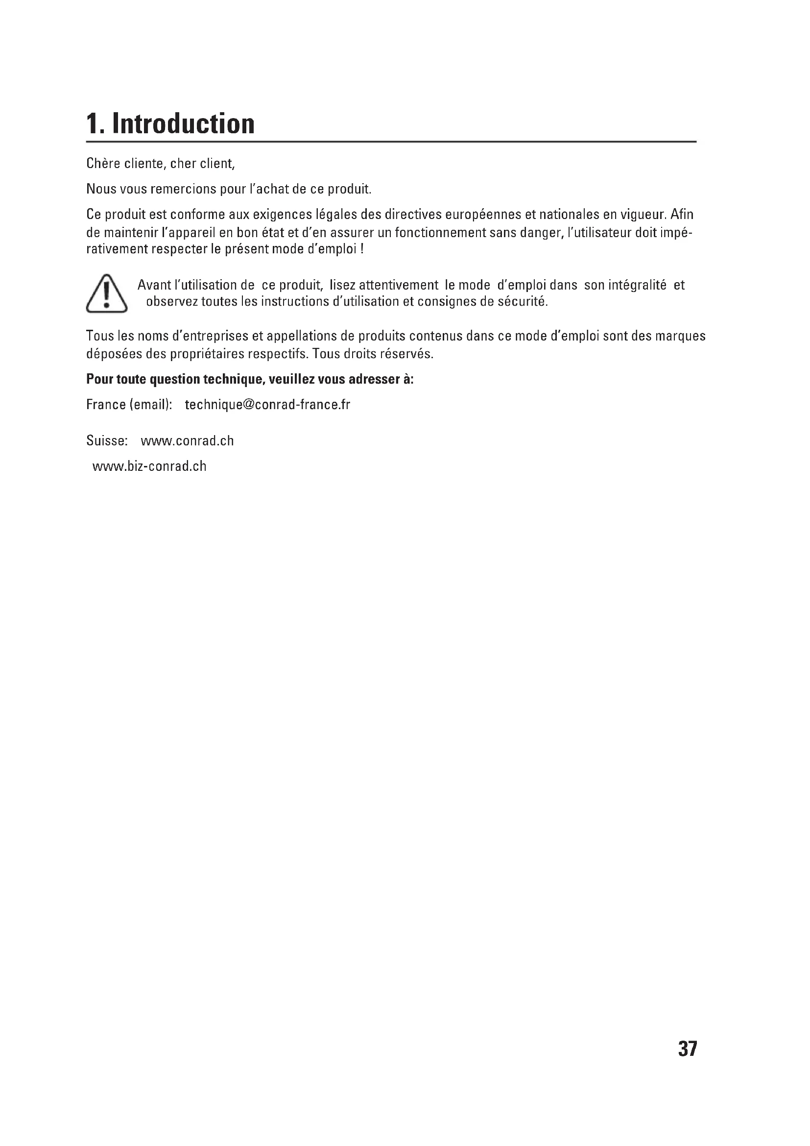 Chère cliente, cher client, Nous vous remercions pour l’achat de ce produit. Ce produit est conforme aux exigences légales des directives européennes et nationales en vigueur. Afin de maintenir l’appareil en bon état et d’en assurer un fonctionnement sans danger, l’utilisateur doit impé- rativement respecter le présent mode d’emploi ! Avant l’utilisation de ce produit, lisez attentivement le mode d’emploi dans son intégralité et observez toutes les instructions d’utilisation et consignes de sécurité. Tous les noms d’entreprises et appellations de produits contenus dans ce mode d’emploi sont des marques déposées des propriétaires respectifs. Tous droits réservés. Pour toute question technique, veuillez vous adresser à: France (email): technique@conrad-france.fr Suisse: www.conrad.ch www.biz-conrad.ch38
