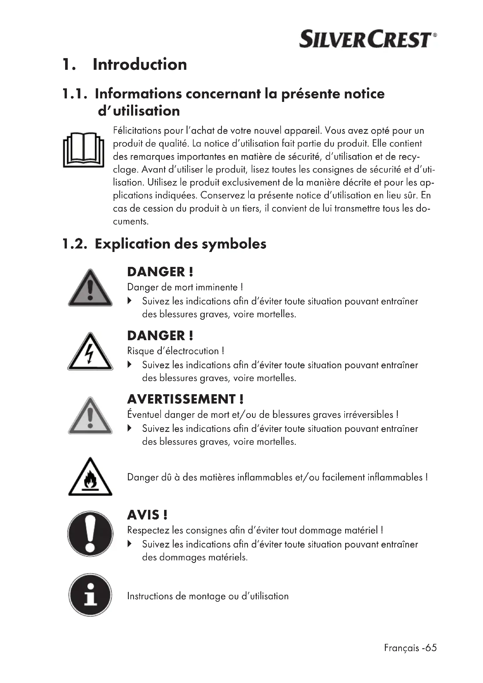1.1. Informations concernant la présente notice d’utilisation Félicitations pour l’achat de votre nouvel appareil. Vous avez opté pour un produit de qualité. La notice d’utilisation fait partie du produit. Elle contient des remarques importantes en matière de sécurité, d’utilisation et de recy- clage. Avant d’utiliser le produit, lisez toutes les consignes de sécurité et d’uti- lisation. Utilisez le produit exclusivement de la manière décrite et pour les ap- plications indiquées. Conservez la présente notice d’utilisation en lieu sûr. En cas de cession du produit à un tiers, il convient de lui transmettre tous les do- cuments. 1.2. Explication des symboles DANGER! Danger de mort imminente! Suivez les indications afin d’éviter toute situation pouvant entraîner des blessures graves, voire mortelles. DANGER! Risque d’électrocution! Suivez les indications afin d’éviter toute situation pouvant entraîner des blessures graves, voire mortelles. AVERTISSEMENT! Éventuel danger de mort et/ou de blessures graves irréversibles! Suivez les indications afin d’éviter toute situation pouvant entraîner des blessures graves, voire mortelles. Danger dû à des matières inflammables et/ou facilement inflammables! AVIS! Respectez les consignes afin d’éviter tout dommage matériel! Suivez les indications afin d’éviter toute situation pouvant entraîner des dommages matériels. Instructions de montage ou d’utilisation66 - Français Tenez compte des remarques contenues dans la notice d’utilisation! Courant alternatif