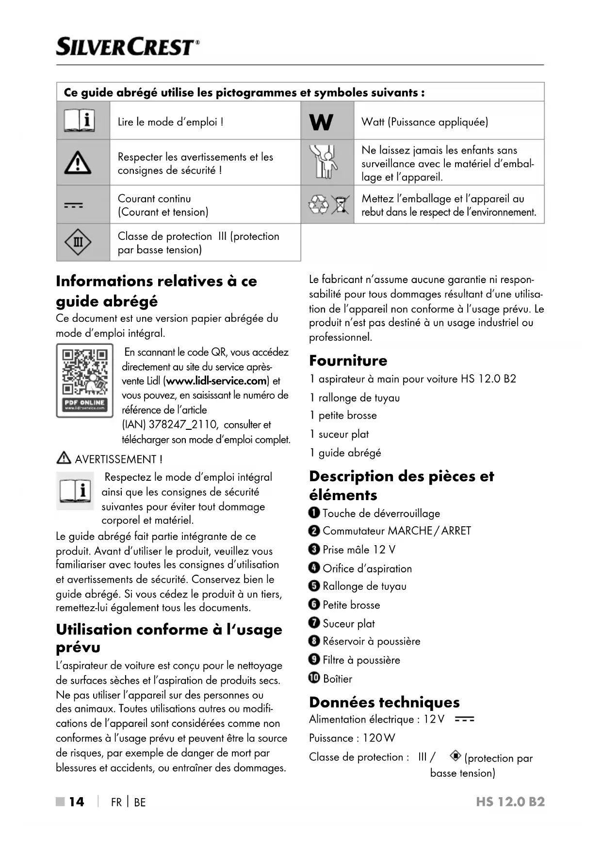 Informations relatives à ce guide abrégé Ce document est une version papier abrégée du mode d’emploi intégral. En scannant le code QR, vous accédez directement au site du service après- vente Lidl (www.lidl-service.com) et vous pouvez, en saisissant le numéro de référence de l‘article (IAN) 378247_2110, consulter et télécharger son mode d‘emploi complet. AVERTISSEMENT ! Respectez le mode d’emploi intégral ainsi que les consignes de sécurité suivantes pour éviter tout dommage corporel et matériel. Le guide abrégé fait partie intégrante de ce produit. Avant d’utiliser le produit, veuillez vous familiariser avec toutes les consignes d’utilisation et avertissements de sécurité. Conservez bien le guide abrégé. Si vous cédez le produit à un tiers, remettez-lui également tous les documents. Utilisation conforme à l‘usage prévu L’aspirateur de voiture est conçu pour le nettoyage de surfaces sèches et l’aspiration de produits secs. Ne pas utiliser l’appareil sur des personnes ou des animaux. Toutes utilisations autres ou modifi- cations de l’appareil sont considérées comme non conformes à l’usage prévu et peuvent être la source de risques, par exemple de danger de mort par blessures et accidents, ou entraîner des dommages. Le fabricant n’assume aucune garantie ni respon- sabilité pour tous dommages résultant d’une utilisa- tion de l’appareil non conforme à l’usage prévu. Le produit n’est pas destiné à un usage industriel ou professionnel. Fourniture 1 aspirateur à main pour voiture HS 12.0 B2 1 rallonge de tuyau 1 petite brosse 1 suceur plat 1 guide abrégé Description des pièces et éléments Touche de déverrouillage Commutateur MARCHE / ARRET Prise mâle 12 V Orifice d‘aspiration Rallonge de tuyau Petite brosse Suceur plat Réservoir à poussière Filtre à poussière Boîtier Données techniques Alimentation électrique: 12 V Puissance: 120 W Classe de protection : III / (protection par basse tension) Ce guide abrégé utilise les pictogrammes et symboles suivants : Lire le mode d‘emploi !