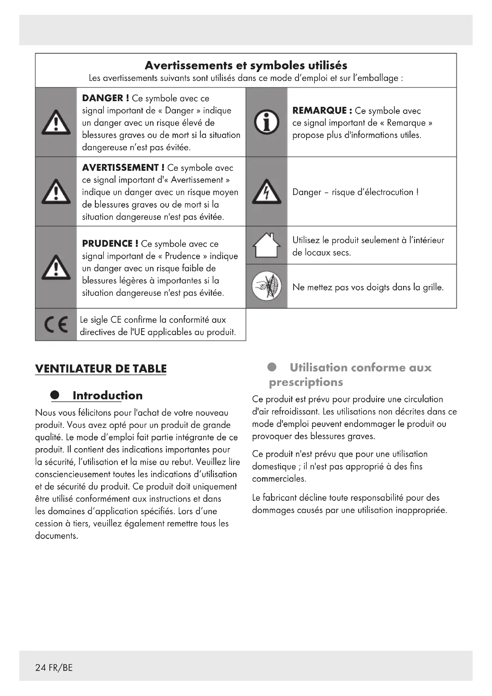Introduction Nous vous félicitons pour l'achat de votre nouveau produit. Vous avez opté pour un produit de grande qualité. Le mode d‘emploi fait partie intégrante de ce produit. Il contient des indications importantes pour la sécurité, l’utilisation et la mise au rebut. Veuillez lire consciencieusement toutes les indications d‘utilisation et de sécurité du produit. Ce produit doit uniquement être utilisé conformément aux instructions et dans les domaines d‘application spécifiés. Lors d‘une cession à tiers, veuillez également remettre tous les documents. Utilisation conforme aux prescriptions Ce produit est prévu pour produire une circulation d'air refroidissant. Les utilisations non décrites dans ce mode d'emploi peuvent endommager le produit ou provoquer des blessures graves. Ce produit n'est prévu que pour une utilisation domestique; il n'est pas approprié à des fins commerciales. Le fabricant décline toute responsabilité pour des dommages causés par une utilisation inappropriée.25 FR/BE Contenu de l'emballage Déballez le produit. Éliminez les blocages installés pour le transport. Accessoires nécessaires: Paire de ciseaux (ill. B) Après avoir déballé le produit, vérifiez s'il est en bon état et contrôlez son exhaustivité. Avant l'utilisation, enlevez tous les matériaux d'emballage, y compris les films de protection. 1x Bloc moteur (avec capuchon de blocage et vis de blocage (x 4)) et tube (avec vis à tête moletée) 1x Socle 1x Grille avant (avec vis de blocage et contre- écrou) 1x Grille arrière 1x Pale REMARQUE: Divers composants amovibles sont livrés pré-assemblés (voir «Description des pièces»). Description des pièces Avant de lire, dépliez la page attenante avec les illustrations. Familiarisez-vous avec toutes les fonctions du produit. Ill. A [1] *Capuchon de blocage [2] Pale [3] Rainure [4] Grille arrière [5] Poignée [6] Arbre du moteur [7] Bouton de réglage de la vitesse (0, I, II, III) [8] Bouton de l'oscillation [9] Bloc moteur