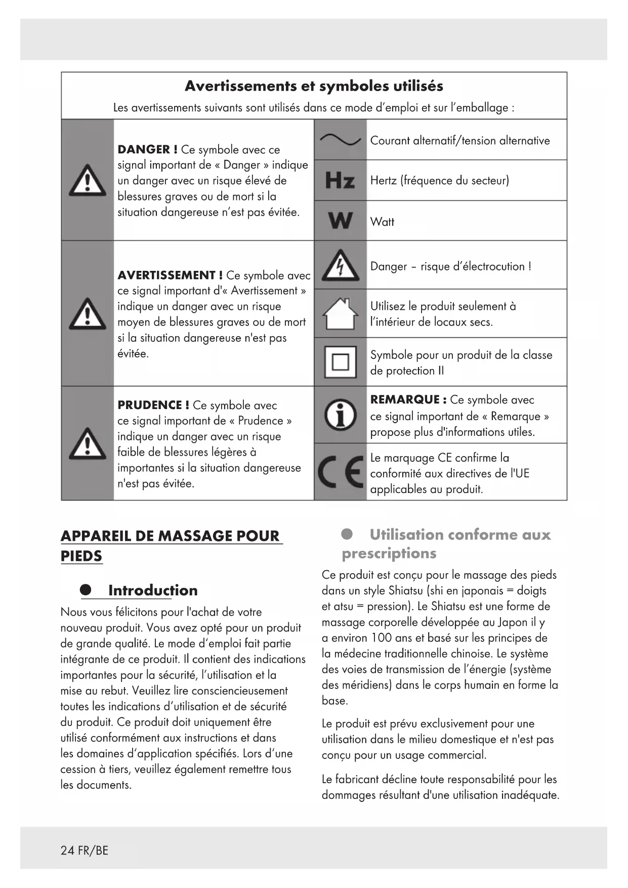 PIEDS Introduction Nous vous félicitons pour l'achat de votre nouveau produit. Vous avez opté pour un produit de grande qualité. Le mode d‘emploi fait partie intégrante de ce produit. Il contient des indications importantes pour la sécurité, l’utilisation et la mise au rebut. Veuillez lire consciencieusement toutes les indications d‘utilisation et de sécurité du produit. Ce produit doit uniquement être utilisé conformément aux instructions et dans les domaines d‘application spécifiés. Lors d‘une cession à tiers, veuillez également remettre tous les documents. Utilisation conforme aux prescriptions Ce produit est conçu pour le massage des pieds dans un style Shiatsu (shi en japonais = doigts et atsu = pression). Le Shiatsu est une forme de massage corporelle développée au Japon il y a environ 100ans et basé sur les principes de la médecine traditionnelle chinoise. Le système des voies de transmission de l’énergie (système des méridiens) dans le corps humain en forme la base. Le produit est prévu exclusivement pour une utilisation dans le milieu domestique et n'est pas conçu pour un usage commercial. Le fabricant décline toute responsabilité pour les dommages résultant d'une utilisation inadéquate.25FR/BE Contenu de l'emballage Après l'ouverture du produit, vérifiez l'exhaustivité de la livraison et si toutes les pièces sont en parfait état. Retirez tous les matériaux d'emballage avant l'utilisation. 1x Appareil de massage pour pieds 1x Mode d'emploi Description des pièces (Ill. A) [1] Surface de massage (avec respectivement 9têtes de massage Shiatsu de chaque côté) [2] (Touche de vitesse/chaleur avec voyant) [3] (Touche marche/arrêt avec voyant) [4] Pied à hauteur réglable [5] Cordon d'alimentation avec fiche de secteur [6] Enrouleur de cordon Données techniques Tension d’entrée: 220–240 V∼, 50–60 Hz Classe deprotection: II/ Consommation d'énergie: 35 W Consignes de sécurité AVANT D'UTILISER LE PRODUIT, FAMILIARISEZ-VOUS AVEC