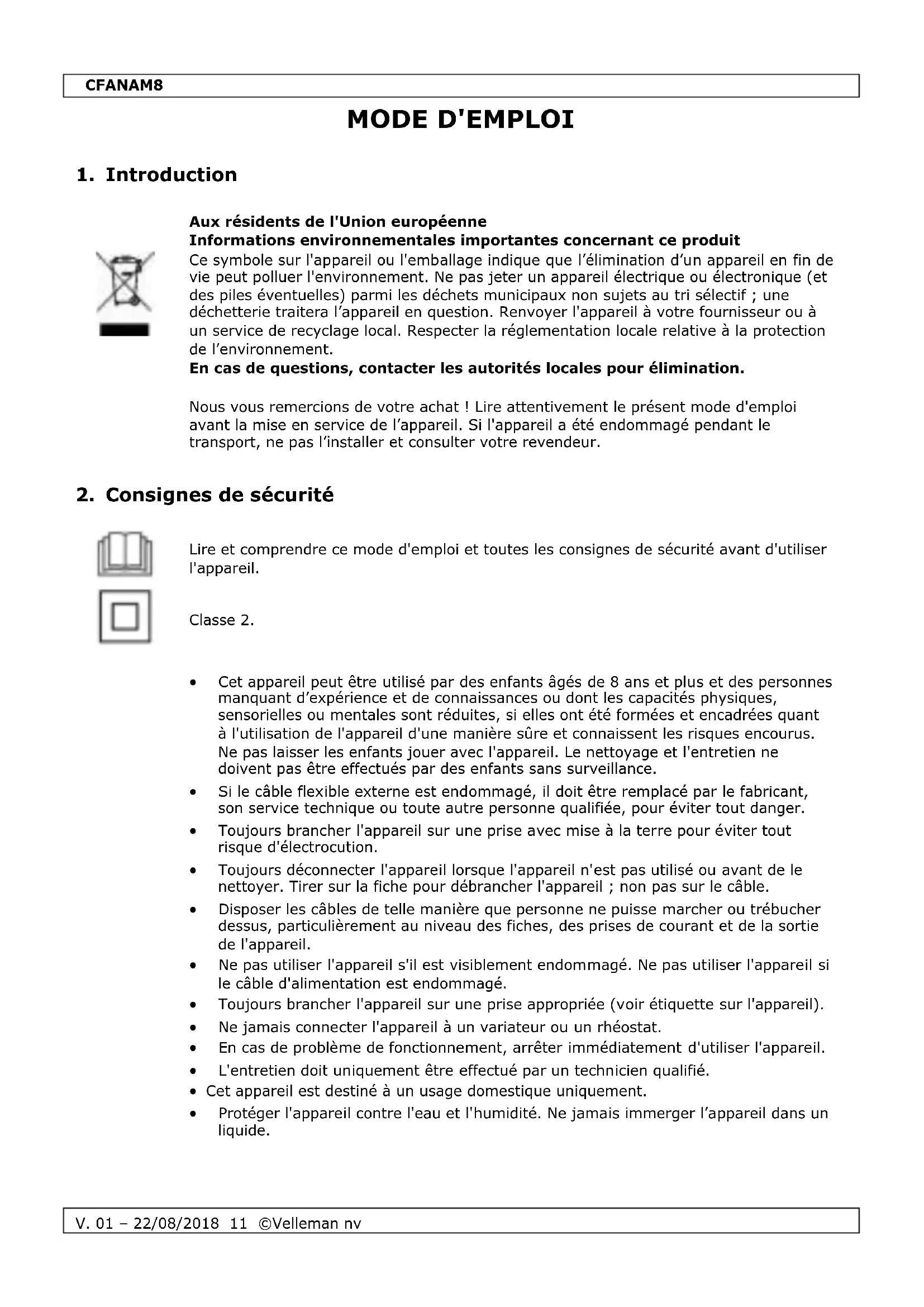 Retrouvez gratuitement la notice de l'appareil CFANAM8 VELLEMAN au format PDF.