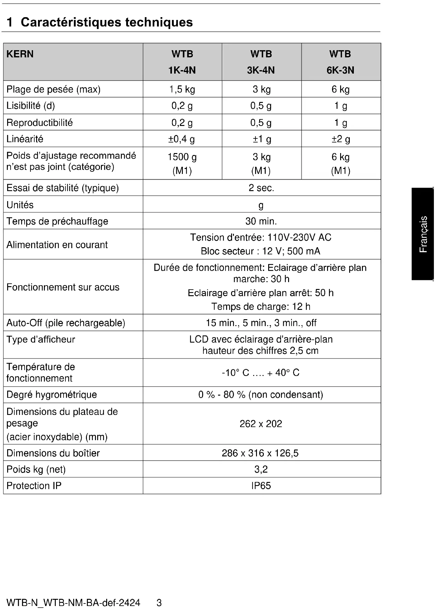 Temps de préchauffage 30 min. Alimentation en courant Tension d'entrée: 110V-230V AC Bloc secteur : 12 V; 500 mA Fonctionnement sur accus Durée de fonctionnement: Eclairage d’arrière plan marche: 30 h Eclairage d’arrière plan arrêt: 50 h Temps de charge: 12 h Auto-Off (pile rechargeable) 15 min., 5 min., 3 min., off Type d’afficheur LCD avec éclairage d'arrière-plan hauteur des chiffres 2,5 cm Température de fonctionnement -10° C …. + 40° C Degré hygrométrique 0 % - 80 % (non condensant) Dimensions du plateau de pesage (acier inoxydable) (mm) 262 x 202 Dimensions du boîtier 286 x 316 x 126,5 Poids kg (net) 3,2 Protection IP IP654 WTB-N_WTB-NM-BA-def-2424 Français KERN WTB 10K-3N WTB 30K-3N Plage de pesée (max) 15 kg 30 kg Lisibilité (d) 2 g 5 g Reproductibilité 2 g 5 g Linéarité ±4 g ±10 g Poids d’ajustage recommandé n’est pas joint (catégorie) 15 kg ( M1 ) 30 kg ( M1 ) Essai de stabilité (typique) 2 sec. Unités
