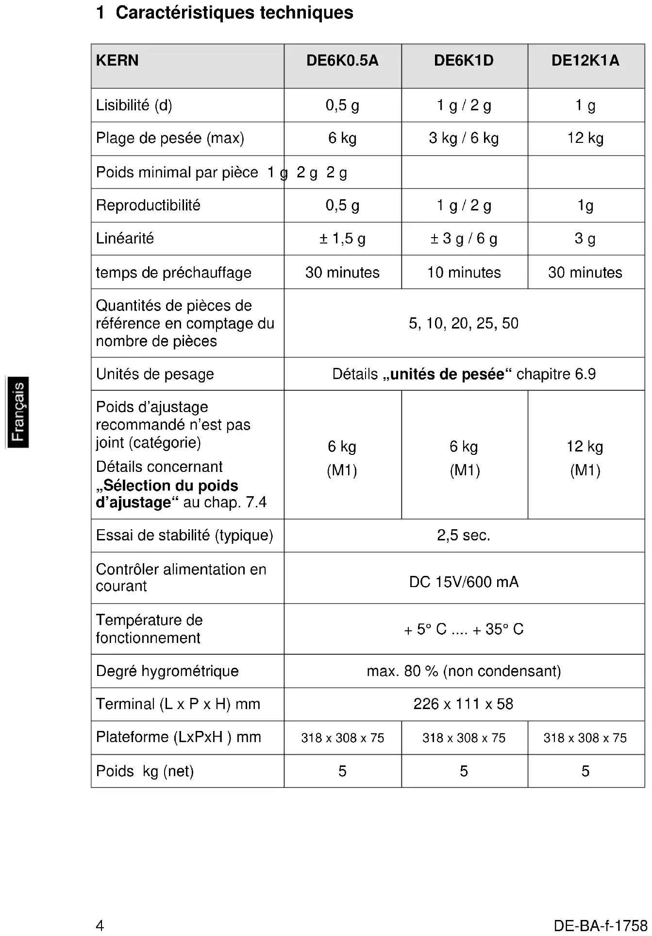 1 Caractéristiques techniques KERN DE6K0.5A DE6K1D DE12K1A Lisibilité (d) 0,5 g 1 g / 2 g 1 g Plage de pesée (max) 6 kg 3 kg / 6 kg 12 kg Poids minimal par pièce 1 g 2 g 2 g Reproductibilité 0,5 g 1 g / 2 g 1g Linéarité ± 1,5 g ± 3 g / 6 g 3 g temps de préchauffage 30 minutes 10 minutes 30 minutes Quantités de pièces de référence en comptage du nombre de pièces 5, 10, 20, 25, 50 Unités de pesage Détails „unités de pesée“ chapitre 6.9 Poids d’ajustage recommandé n’est pas joint (catégorie) Détails concernant „Sélection du poids d’ajustage“ au chap. 7.4 6 kg (M1) 6 kg (M1) 12 kg (M1) Essai de stabilité (typique) 2,5 sec. Contrôler alimentation en courant DC 15V/600 mA Température de fonctionnement + 5° C .... + 35° C Degré hygrométrique max. 80 % (non condensant) Terminal (L x P x H) mm 226 x 111 x 58 Plateforme (LxPxH ) mm 318 x 308 x 75 318 x 308 x 75 318 x 308 x 75 Poids kg (net) 5 5 5DE-BA-f-1758