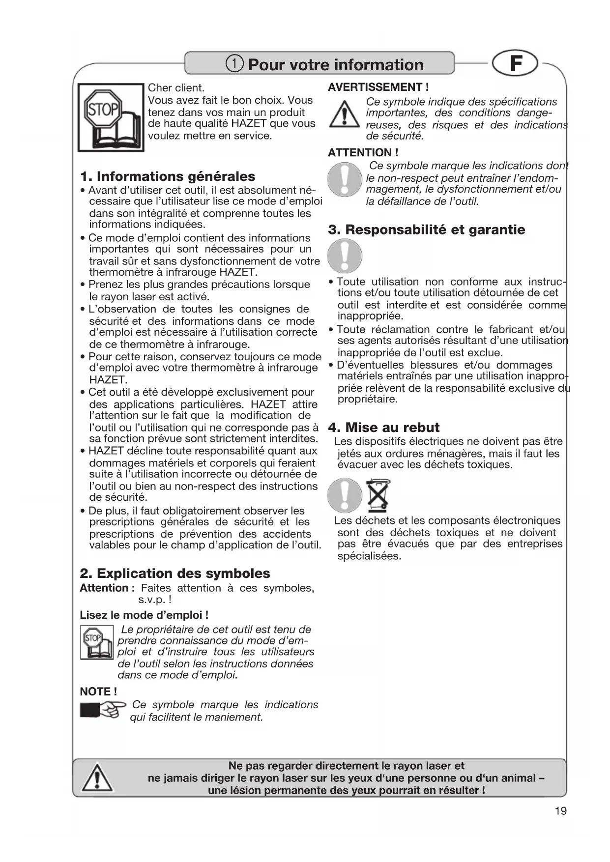 Ne pas regarder directement le rayon laser et ne jamais diriger le rayon laser sur les yeux d‘une personne ou d‘un animal – une lésion permanente des yeux pourrait en résulter ! Cher client. Vous avez fait le bon choix. Vous tenez dans vos main un produit de haute qualité HAZET que vous voulez mettre en service.