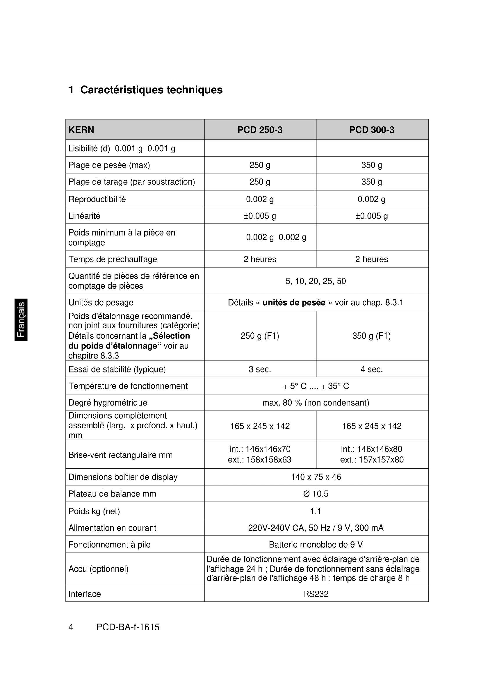 165 x 280 x 73 Dimensions boîtier de display 140 x 75 x 46 Plateau de balance mm 160x160 Poids kg (net) 1.6 1.9 Alimentation en courant 220V-240V CA, 50 Hz / 9 V, 300 mA Fonctionnement à pile Batterie monobloc de 9 V Accu (optionnel) Durée de fonctionnement avec éclairage d'arrière-plan de l'affichage 24 h ; Durée de fonctionnement sans éclairage d'arrière-plan de l'affichage 48 h ; temps de charge 8 h Interface RS2326 PCD-BA-f-1615 KERN PCD 6K-4 PCD 10K0.1 PCD 10K3 Lisibilité (d) 0.1 g 0.1 g 1 g Plage de pesée (max) 6000 g 10 kg 10 kg Plage de tarage (par soustraction) 6000 g 10 kg 10 kg Reproductibilité 0.1 g 0.1 g 1 g Linéarité ±0.3 g ±0.3 g ±3 g Poids minimum à la pièce en comptage