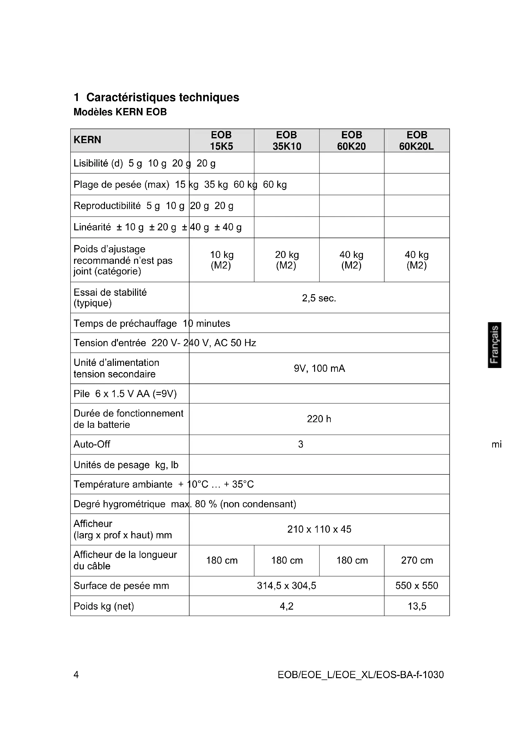 1 Caractéristiques techniques Modèles KERN EOB KERN EOB 15K5 EOB 35K10 EOB 60K20 EOB 60K20L Lisibilité (d) 5 g 10 g 20 g 20 g Plage de pesée (max) 15 kg 35 kg 60 kg 60 kg Reproductibilité 5 g 10 g 20 g 20 g Linéarité ± 10 g ± 20 g ± 40 g ± 40 g Poids d’ajustage recommandé n’est pas joint (catégorie) 10 kg (M2) 20 kg (M2) 40 kg (M2) 40 kg (M2) Essai de stabilité (typique) 2,5 sec. Temps de préchauffage 10 minutes Tension d'entrée 220 V- 240 V, AC 50 Hz Unité d’alimentation tension secondaire 9V, 100 mA Pile 6 x 1.5 V AA (=9V) Durée de fonctionnement de la batterie 220 h Auto-Off 3 minutes Unités de pesage kg, lb Température ambiante + 10°C … + 35°C Degré hygrométrique max. 80 % (non condensant) Afficheur (larg x prof x haut) mm 210 x 110 x 45 Afficheur de la longueur du câble 180 cm 180 cm 180 cm 270 cm Surface de pesée mm 314,5 x 304,5 550 x 550 Poids kg (net) 4,2 13,5EOB/EOE_L/EOE_XL/EOS-BA-f-1030
