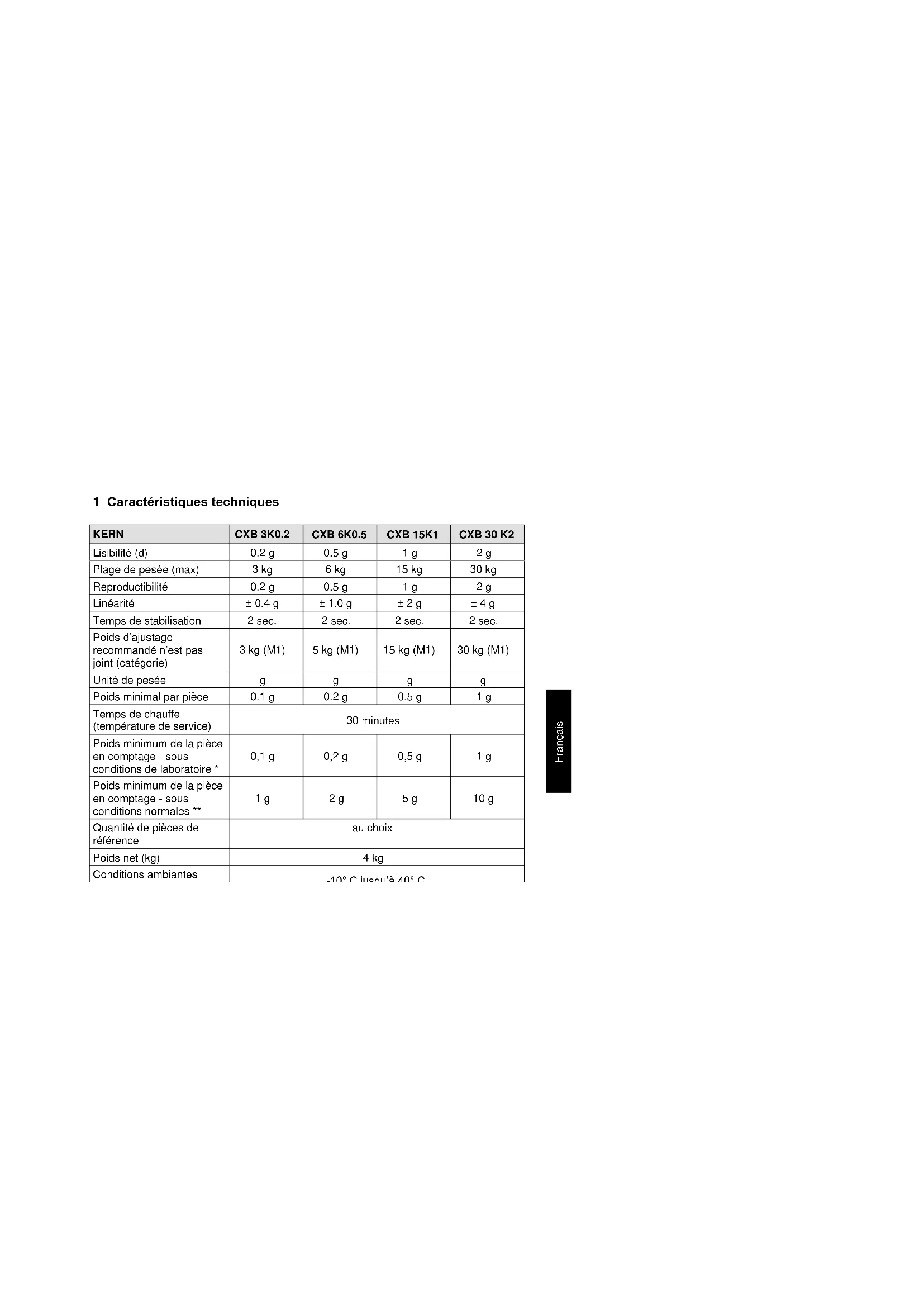 Pile rechargeable Sans éclairage d’arrière-plan de l'affichage: Durée de fonctionnement env. 200 heures / durée de chargement environ 8 heures Avec éclairage d’arrière-plan de l'affichage Autonomie de 60h environ / Temps / durée de chargement environ 8 heures4 CXB-BA-def-2425 Français KERN CXB 3K1NM CXB 6K2NM CXB 15K5NM CXB 30K10NM Lisibilité (d) 1 g 2 g 5 g 10 g Plage de pesée (max) 3 kg 6 kg 15 kg 30 kg Poids minimum (min) 20 g 40 g 100 g 200 g Echelon d’étalonnage (e) 1 g 2 g 5 g 10 g Reproductibilité 1 g 2 g 5 g 10 g Linéarité 2 g 4 g 10 g 20 g Classe d’étalonnage III III III III Temps de stabilisation 2 sec. 2 sec. 2 sec. 2 sec. Poids d’ajustage recommandé n’est pas joint (catégorie) 3 kg (M1) 6 kg (M1) 15 kg (M1) 30 kg (M1) Unité de pesée