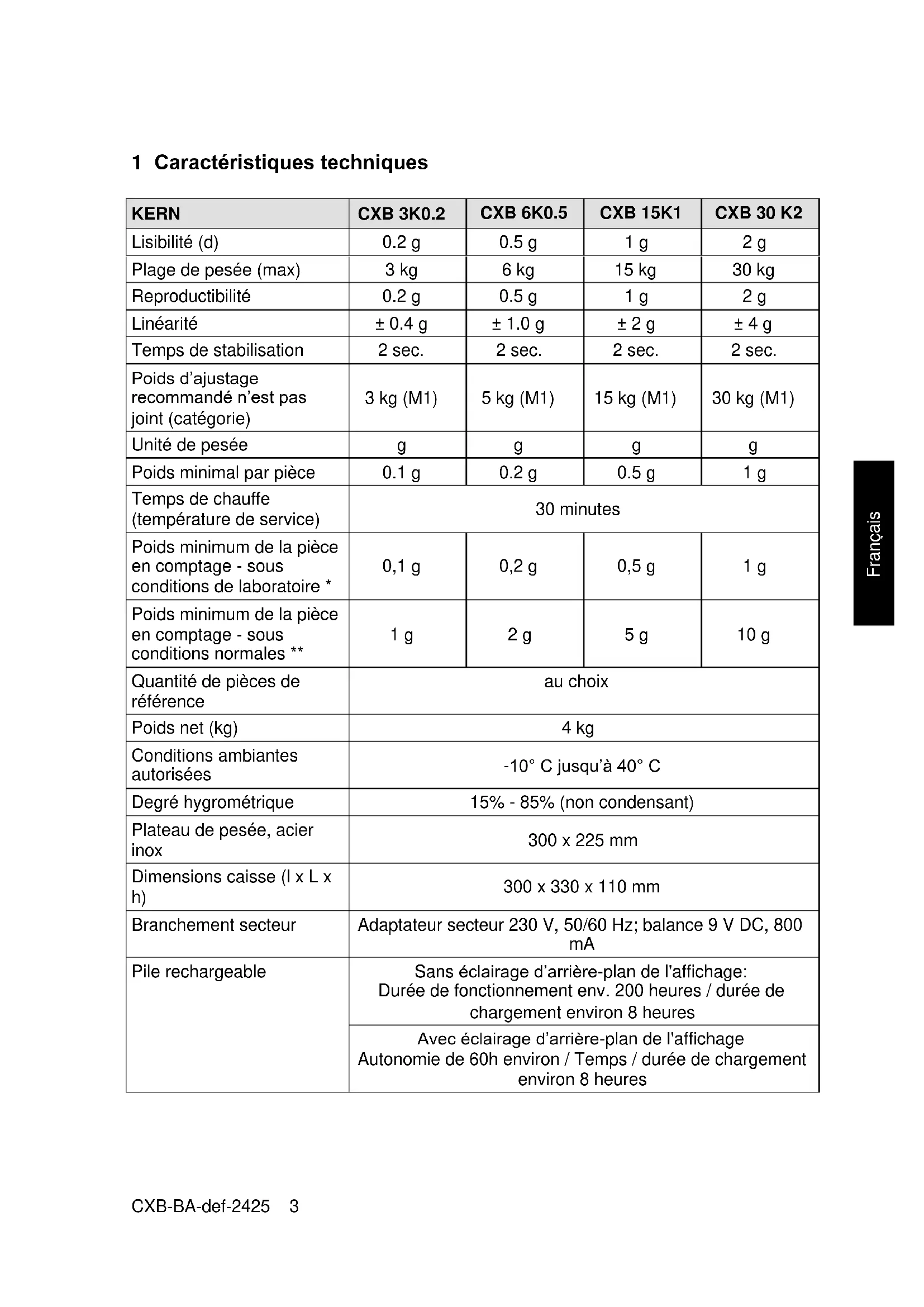 Pile rechargeable Sans éclairage d’arrière-plan de l'affichage: Durée de fonctionnement env. 200 heures / durée de chargement environ 8 heures Avec éclairage d’arrière-plan de l'affichage Autonomie de 60h environ / Temps / durée de chargement environ 8 heures4 CXB-BA-def-2425 Français KERN CXB 3K1NM CXB 6K2NM CXB 15K5NM CXB 30K10NM Lisibilité (d) 1 g 2 g 5 g 10 g Plage de pesée (max) 3 kg 6 kg 15 kg 30 kg Poids minimum (min) 20 g 40 g 100 g 200 g Echelon d’étalonnage (e) 1 g 2 g 5 g 10 g Reproductibilité 1 g 2 g 5 g 10 g Linéarité 2 g 4 g 10 g 20 g Classe d’étalonnage III III III III Temps de stabilisation 2 sec. 2 sec. 2 sec. 2 sec. Poids d’ajustage recommandé n’est pas joint (catégorie) 3 kg (M1) 6 kg (M1) 15 kg (M1) 30 kg (M1) Unité de pesée