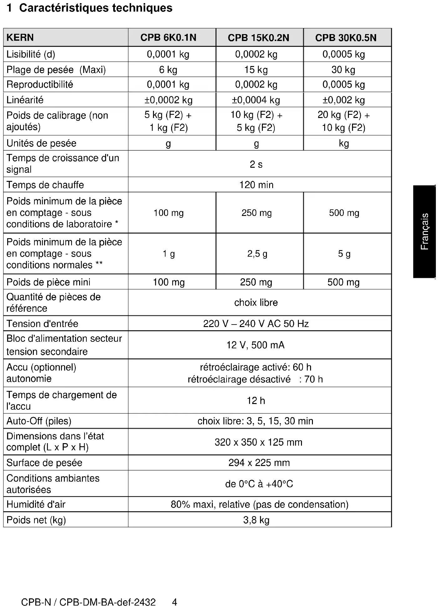 Temps de croissance d'un signal 2 s Temps de chauffe 120 min Poids minimum de la pièce en comptage - sous conditions de laboratoire * 100 mg 250 mg 500 mg Poids minimum de la pièce en comptage - sous conditions normales ** 1 g 2,5 g 5 g Poids de pièce mini 100 mg 250 mg 500 mg Quantité de pièces de référence choix libre Tension d'entrée 220 V – 240 V AC 50 Hz Bloc d'alimentation secteur tension secondaire 12 V, 500 mA Accu (optionnel) autonomie rétroéclairage activé: 60 h rétroéclairage désactivé : 70 h Temps de chargement de l'accu 12 h Auto-Off (piles) choix libre: 3, 5, 15, 30 min Dimensions dans l’état complet (L x P x H) 320 x 350 x 125 mm Surface de pesée 294 x 225 mm Conditions ambiantes autorisées de 0°C à +40°C Humidité d'air 80% maxi, relative (pas de condensation) Poids net (kg) 3,8 kg5 CPB-N / CPB-DM-BA-def-2432 Français KERN