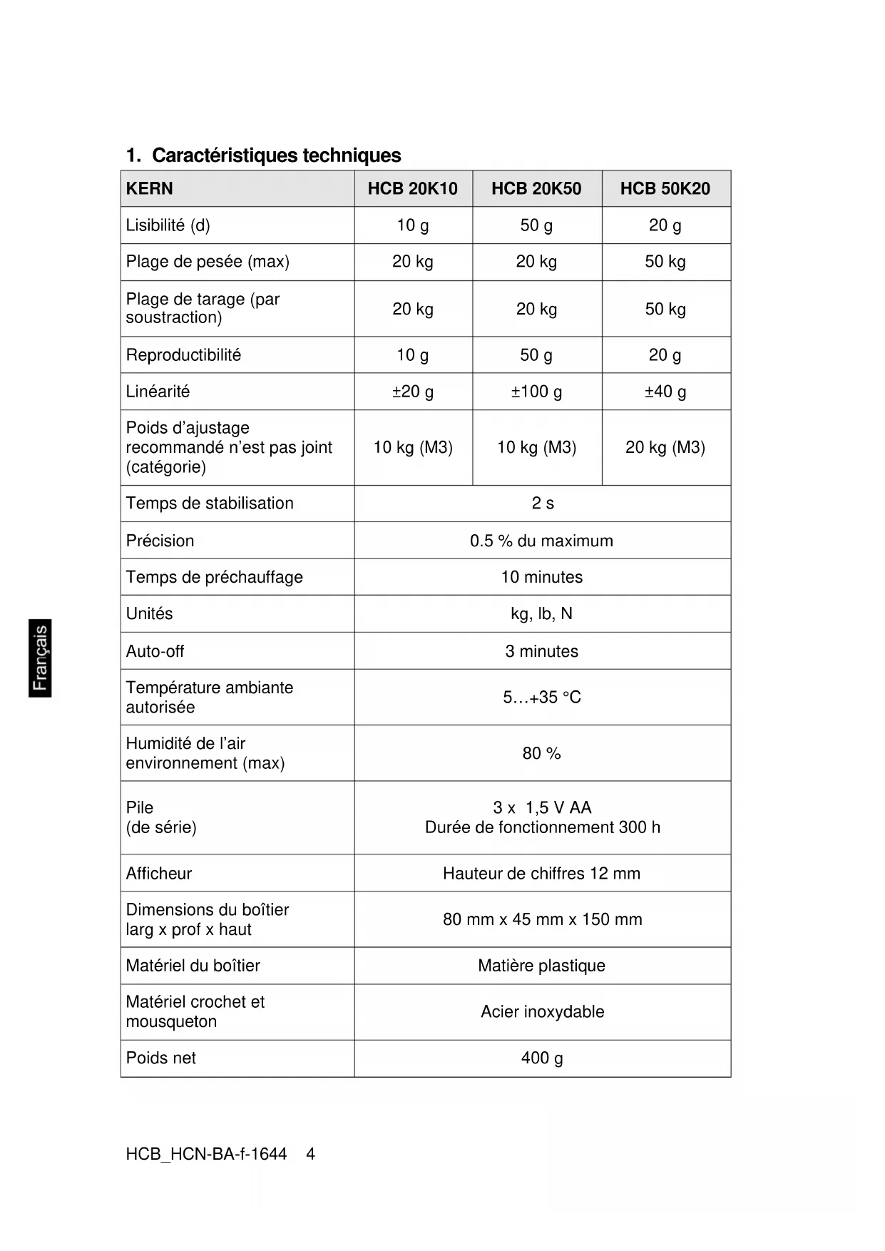 Lisibilité (d) 100 g 500 g Plage de pesée (max) 200 kg 200 kg Plage de tarage (par soustraction) 200 kg 200 kg Reproductibilité 100 g 500 g Linéarité ±200 g ±1000 g Poids d’ajustage recommandé n’est pas joint (catégorie) 100 kg (M3) 100 kg (M3) Temps de stabilisation 2 s Précision 0.5 % du maximum Temps de préchauffage 10 minutes Unités kg, lb, N Auto-off 3 minutes Température ambiante autorisée 5…+35 °C Humidité de l’air environnement (max) 80 % Pile (de série) 3 x 1,5 V AA Durée de fonctionnement 300 h Afficheur Hauteur de chiffres 12 mm Dimensions du boîtier larg x prof x haut 80 mm x 45 mm x 150 mm Matériel du boîtier Matière plastique Matériel crochet et mousqueton Acier inoxydable Poids net 400 g7 HCB_HCN-BA-f-1543