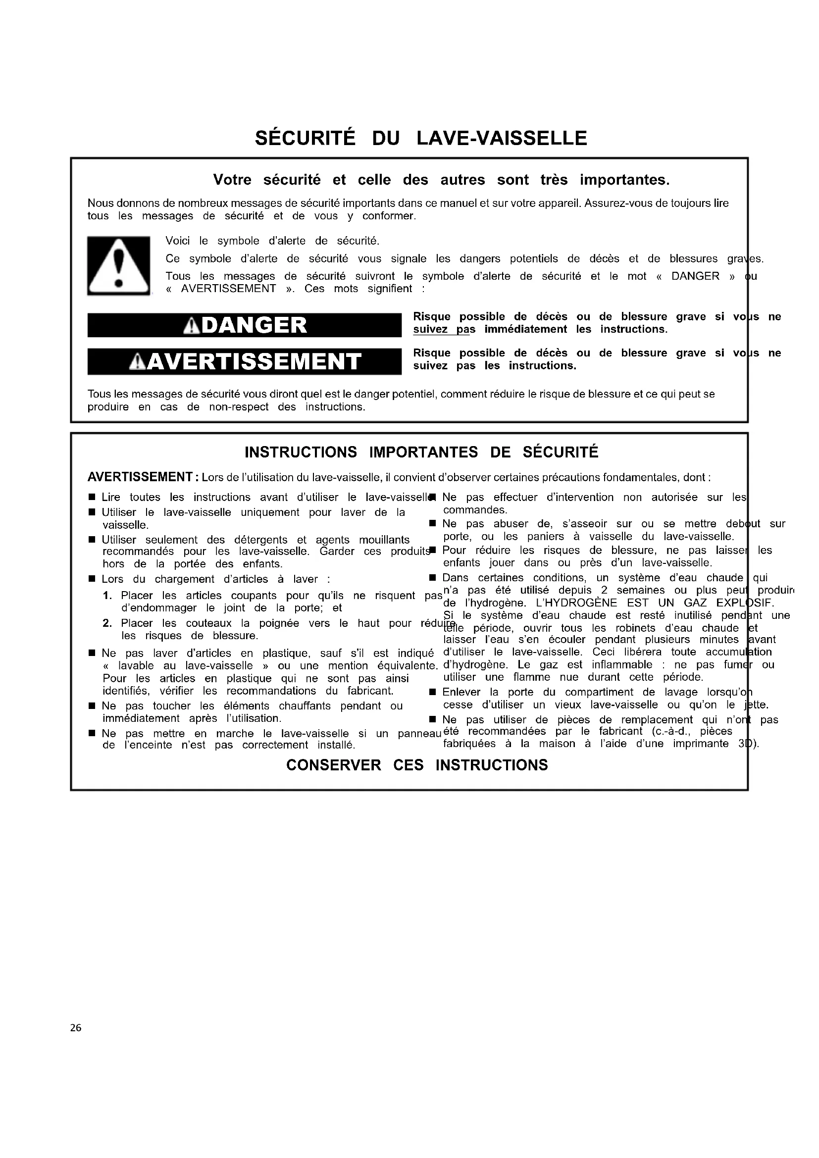les risques de blessure. Ne pas laver d’articles en plastique, sauf s’il est indiqué « lavable au lave-vaisselle » ou une mention équivalente. Pour les articles en plastique qui ne sont pas ainsi identifiés, vérifier les recommandations du fabricant. Ne pas toucher les éléments chauffants pendant ou immédiatement après l’utilisation. Ne pas mettre en marche le lave-vaisselle si un panneau de l’enceinte n’est pas correctement installé. Ne pas effectuer d’intervention non autorisée sur les commandes. Ne pas abuser de, s’asseoir sur ou se mettre debout sur la porte, ou les paniers à vaisselle du lave-vaisselle. Pour réduire les risques de blessure, ne pas laisser les enfants jouer dans ou près d’un lave-vaisselle. Dans certaines conditions, un système d’eau chaude qui n’a pas été utilisé depuis 2 semaines ou plus peut produire de l’hydrogène. L’HYDROGÈNE EST UN GAZ EXPLOSIF. Si le système d’eau chaude est resté inutilisé pendant une telle période, ouvrir tous les robinets d’eau chaude et laisser l’eau s’en écouler pendant plusieurs minutes avant d’utiliser le lave-vaisselle. Ceci libérera toute accumulation d’hydrogène. Le gaz est inflammable : ne pas fumer ou utiliser une flamme nue durant cette période. Enlever la porte du compartiment de lavage lorsqu’on cesse d’utiliser un vieux lave-vaisselle ou qu’on le jette. Ne pas utiliser de pièces de remplacement qui n’ont pas été recommandées par le fabricant (c.-à-d., pièces fabriquées à la maison à l’aide d’une imprimante 3D).