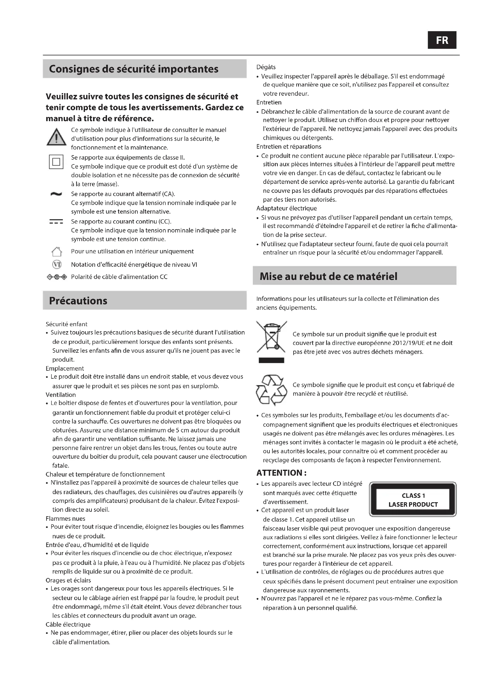 - Les appareils avec lecteur CD intégré sont marqués avec cette étiquette d'avertissement.