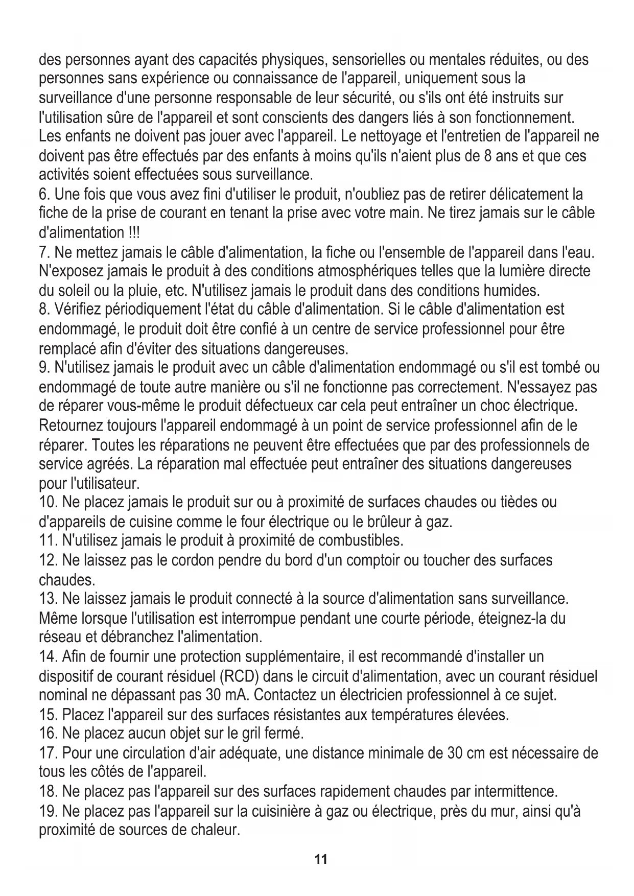 13. Avant d'ajouter le prochain lot d'aliments à griller, fermez le boîtier supérieur afin que les plaques chauffantes atteignent la température réglée.14 Puissance maximale : 3000W Puissance nominale : 2000W Source d'alimentation : 220-240V ~ 50/60Hz DONNÉES TECHNIQUES: Respect de l'environnement. Nous vous prions de bien vouloir trier les emballages en carton ainsi que les sachets plastiques (en polyéthylène). L'appareil usagé ne doit pas être jeté à la poubelle mais remis au point de collecte prévu à cet effet car il contient des éléments pouvant être nocifs pour l'environnement. L'appareil électrique doit être remis de manière à limiter au maximum une éventuelle utilisation ultérieure. Si l'appareil contient des piles, il faut les retirer et les remettre à un autre point de collecte. Ne pas jeter l'appareil dans une poubelle de déchets ménagers !!! CONDICIONES DE SEGURIDAD INSTRUCCIONES IMPORTANTES SOBRE LA SEGURIDAD DE USO POR FAVOR LEA CUIDADOSAMENTE Y GUARDE PARA FUTURAS CONSULTAS Las condiciones de la garantía son diferentes si el dispositivo se utiliza con fines comerciales".