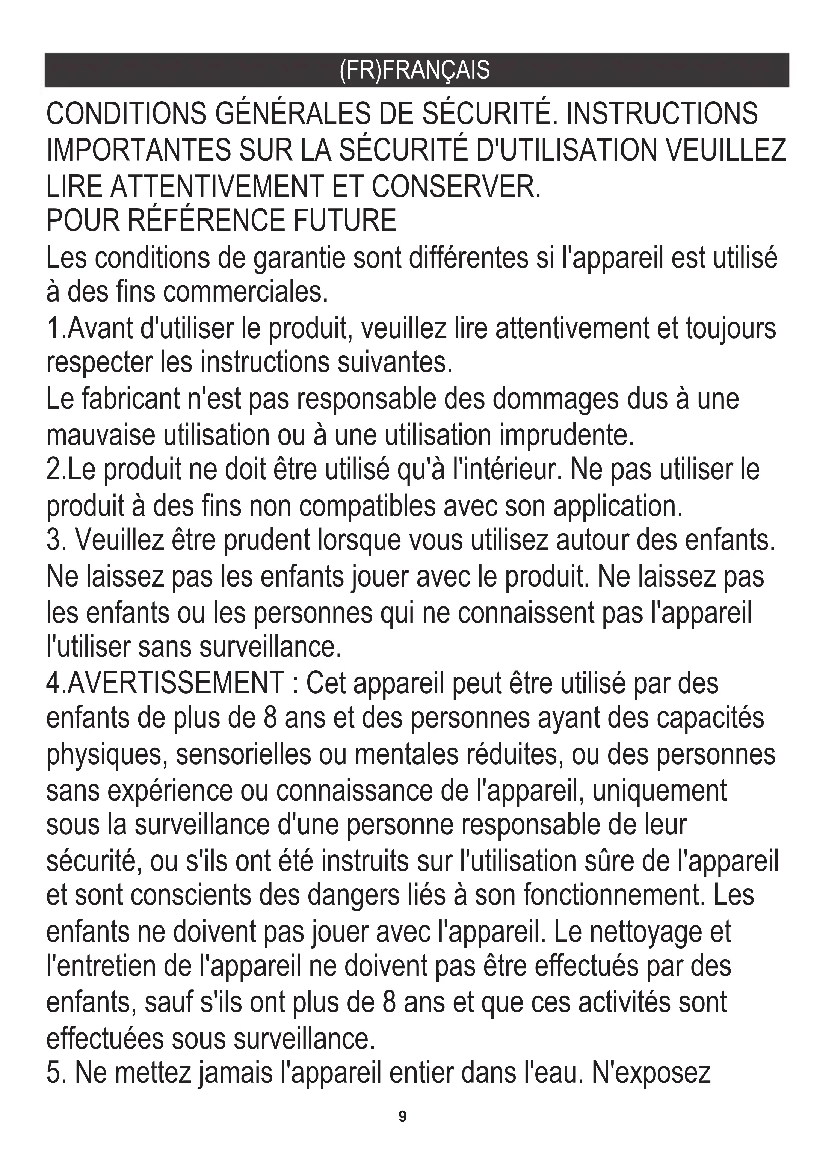 Les conditions de garantie sont différentes si l'appareil est utilisé à des fins commerciales. 1.Avant d'utiliser le produit, veuillez lire attentivement et toujours respecter les instructions suivantes. Le fabricant n'est pas responsable des dommages dus à une mauvaise utilisation ou à une utilisation imprudente. CONDITIONS GÉNÉRALES DE SÉCURITÉ. INSTRUCTIONS IMPORTANTES SUR LA SÉCURITÉ D'UTILISATION VEUILLEZ LIRE ATTENTIVEMENT ET CONSERVER.
