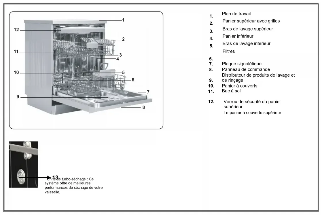 - Installez les couteaux et autres objets pointus dans le panier à couvert, pointe en bas. Si le cordon d'alimentation est endommagé, il doit être remplacé par le9 fabricant, son agent de service ou un technicien qualifié afin d'éviter tout danger. Cet appareil n'est pas destiné, à être utilisé par des personnes (notamment des enfants ) dont les capacités physiques, sensorielles ou intellectuelles sont réduites, ou par des personnes manquant d'expérience ou de connaissances, à moins que celles-ci ne soient sous surveillance ou qu'elles aient reçu des instructions quant à l'utilisation de l'appareil par une personne responsable de leur sécurité.