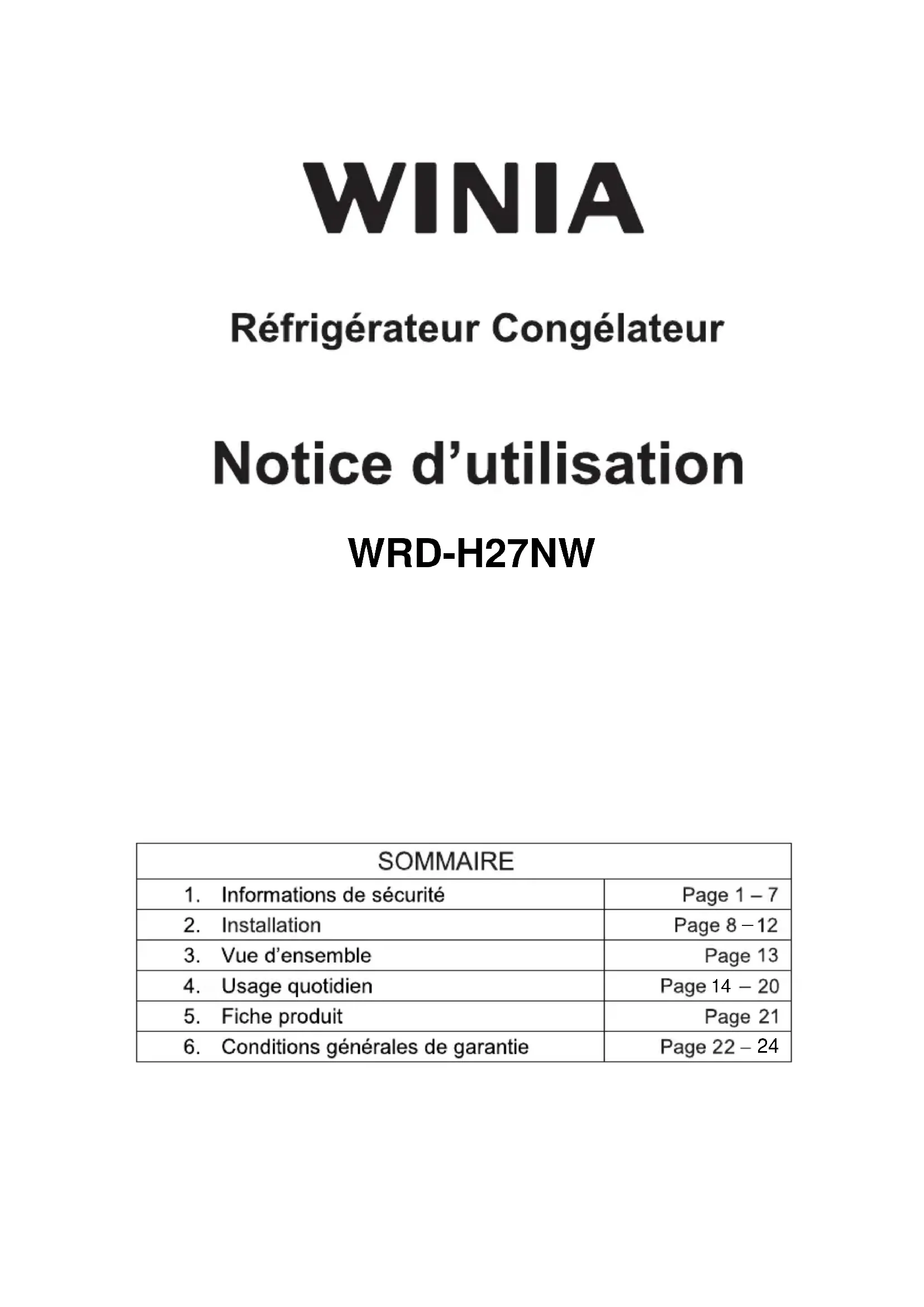 Retrouvez gratuitement la notice de l'appareil WRDH27NW WINIA au format PDF.