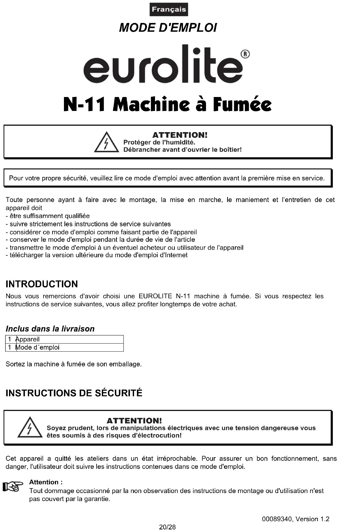 N11 - Machine à effet Eurolite - Notice d'utilisation et mode d'emploi gratuit