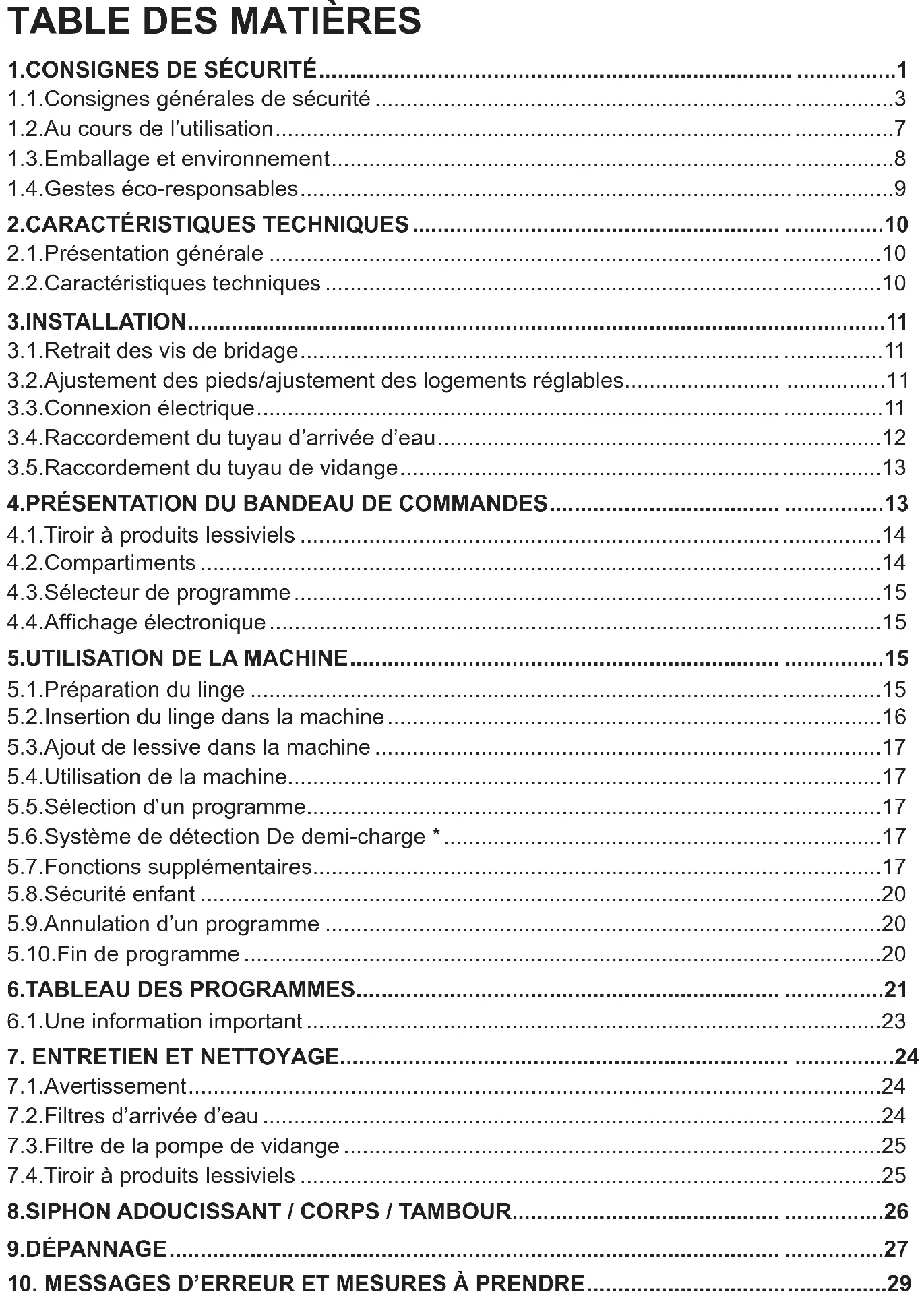 - Ne pas utiliser la fonction Prélavage pour le linge légèrement souillé.Cette mesure contribuera à réduire la consommation d’eau et d’électricité de la machine. Déclaration de conformité CE Nos produits sont conformes aux directives, aux décisions, aux réglementations européennes et aux normes en vigueurs. Élimination de votre ancienne machine Le symbole figurant sur le produit ou sur son emballage indique que cet article ne peut être traité tel un déchet ménager.Il convient donc de le déposer à un point de collecte adapté au recyclage des équipements électriques et électroniques.En veillant à ce que ce produit soit correctement éliminé, vous contribuerez à prévenir les conséquences négatives potentielles sur l’environnement et sur la santé humaine qui pourraient résulter du non-respect de la consigne ci-dessus.Pour de plus amples informations sur le recyclage de cet article, veuillez contacter votre mairie, le service de traitement des déchets de votre commune ou le magasin dans lequel vous avez acheté ce produit.FR - 10
