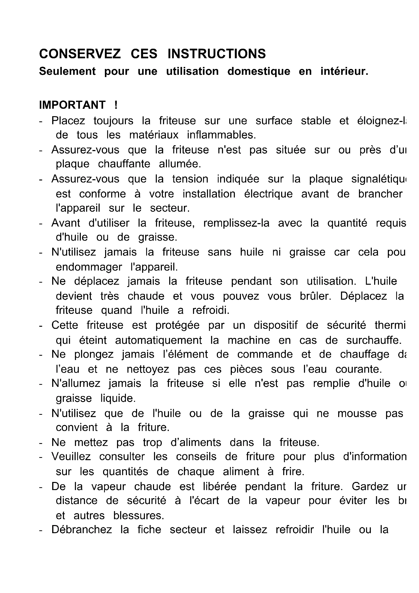 Seulement pour une utilisation domestique en intérieur. IMPORTANT ! - Placez toujours la friteuse sur une surface stable et éloignez-la de tous les matériaux inflammables. - Assurez-vous que la friteuse n'est pas située sur ou près d’une plaque chauffante allumée. - Assurez-vous que la tension indiquée sur la plaque signalétique est conforme à votre installation électrique avant de brancher l'appareil sur le secteur. - Avant d'utiliser la friteuse, remplissez-la avec la quantité requise d'huile ou de graisse. - N'utilisez jamais la friteuse sans huile ni graisse car cela pourrait endommager l'appareil. - Ne déplacez jamais la friteuse pendant son utilisation. L'huile devient très chaude et vous pouvez vous brûler. Déplacez la friteuse quand l'huile a refroidi. - Cette friteuse est protégée par un dispositif de sécurité thermique qui éteint automatiquement la machine en cas de surchauffe. - Ne plongez jamais l’élément de commande et de chauffage dans l’eau et ne nettoyez pas ces pièces sous l’eau courante. - N'allumez jamais la friteuse si elle n'est pas remplie d'huile ou de graisse liquide. - N'utilisez que de l'huile ou de la graisse qui ne mousse pas et qui convient à la friture. - Ne mettez pas trop d’aliments dans la friteuse. - Veuillez consulter les conseils de friture pour plus d'informations sur les quantités de chaque aliment à frire. - De la vapeur chaude est libérée pendant la friture. Gardez une distance de sécurité à l'écart de la vapeur pour éviter les brûlures et autres blessures. - Débranchez la fiche secteur et laissez refroidir l'huile ou lagraisse. Ne déplacez pas la friteuse tant qu'elle n'a pas refroidi. - N'utilisez pas d'accessoires non inclus dans l'appareil. - Gardez l'appareil à l'écart des enfants. - Ne placez pas l'appareil à proximité d'une cuisinière à gaz ou d'une cuisinière électrique ou dans un four chauffé. - N’utilisez pas l’appareil à l'extérieur ou à des fins commerciales. - Ne surchauffez pas l’huile ou la graisse car elle pourra prendre feu. N'utilisez jamais d'eau pour éteindre un feu d'huile de cuisson. - Ne laissez jamais la friteuse sans surveillance pendant son utilisation. Assurez-vous toujours de la sécurité des enfants s'ils se trouvent près de la friteuse. - Si la friteuse et/ou le cordon sont endommagés, ils doivent être réparés par un service après-vente professionnel. - N'essayez pas de réparer vous-même l'appareil ni de remplacer un cordon endommagé. Cela nécessite des outils spéciaux. - Veillez à ne pas endommager l'élément chauffant. (Ne pas le plier ou le casser.) - Le composant électrique est équipé d'une coupure de sécurité qui garantit que l'élément chauffant ne peut fonctionner que lorsque l'élément est correctement placé sur la friteuse. - En cas de surchauffe, le dispositif de protection thermique arrête automatiquement la friteuse. Cet appareil peut être réactivé en poussant le bouton avec un objet pointu (par exemple un stylo à bille) à travers un trou à l'arrière du compartiment de rangement du cordon, marqué avec le mot «Restart». Avant la réactivation, débranchez la friteuse du secteur et attendez que le système soit refroidi. - Si le câble d'alimentation est endommagé, il doit être remplacé par le fabricant, son service après-vente ou des personnes de qualification similaire afin d'éviter un danger. - Cet appareil ne doit pas être utilisé par les enfants de 0 à 8 ans. Cet appareil peut être utilisé par les enfants de plus de 8 ans s’ils sont surveillés de manière continue. Cet appareil peut être utilisépar des personnes ayant leurs capacités physiques, sensorielles ou mentales réduites ou un manque de connaissance s’ils ont bénéficié d’une surveillance ou d’instruction concernant l’utilisation de l’appareil de manière sûre et comprennent les risques encourus. Gardez l’appareil et sa corde hors de la portée des enfants de moins de 8 ans. Le nettoyage et la maintenance usuelle ne doivent pas être apportés par des enfants. - Les appareils de cuisson devront être positionnés sur une surface stable avec les poignées (s’il y a) positionnées de manière à éviter le débordement de liquides chauds. - En ce qui concerne les détails sur la façon de nettoyer les surfaces qui sont au contact des denrées alimentaires ou de l’huile, référez-vous au paragraphe "nettoyage" ci-après. - L’appareil n’est pas prévu pour être utilisé au moyen d’une minuterie externe ou d’un système séparé de commande à distance. - Cet appareil est destiné à être utilisé dans des applications domestiques et analogues telles que : – des coins cuisines réservés au personnel dans des magasins, bureaux et autres environnements professionnels ; – des fermes ; – l’utilisation par les clients des hôtels, motels et autres environnements à caractère résidentiel ; – des environnements du type chambres d’hôtes. - N’immergez pas l’appareil dans l’eau et dans tout autre liquide.