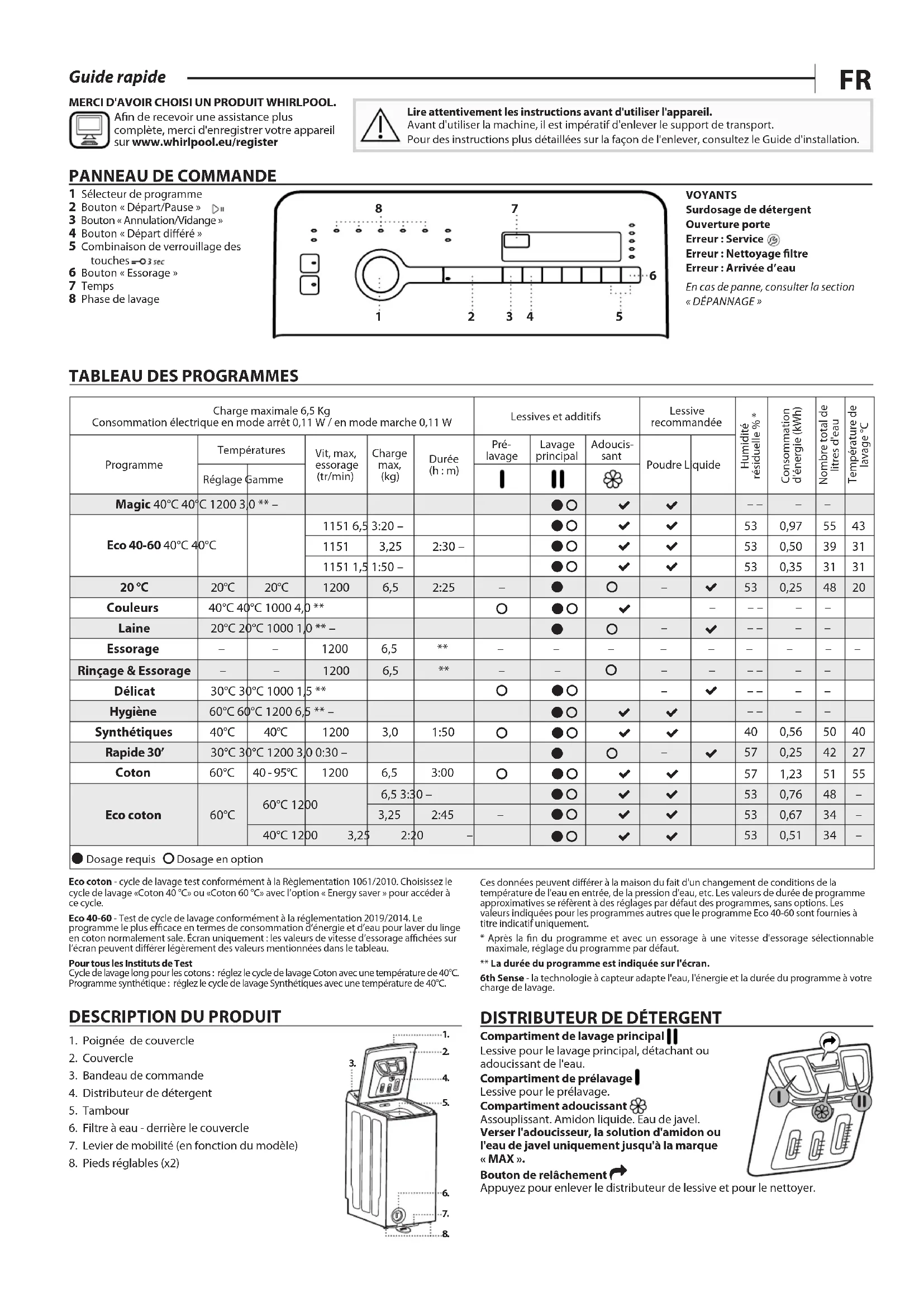 1 Sélecteur de programme 2 Bouton « Départ/Pause » 3 Bouton « Annulation/Vidange » 4 Bouton « Départ diéré » 5 Combinaison de verrouillage des touches 6 Bouton « Essorage » 7 Temps 8 Phase de lavage VOYANTSSurdosage de détergent Ouverture porte Erreur : Service Erreur : Nettoyage ltre Erreur : Arrivée d’eau En cas de panne, consulter la section « DÉPANNAGE » MERCI D'AVOIR CHOISI UN PRODUIT WHIRLPOOL. An de recevoir une assistance plus complète, merci d'enregistrer votre appareil sur www.whirlpool.eu/register