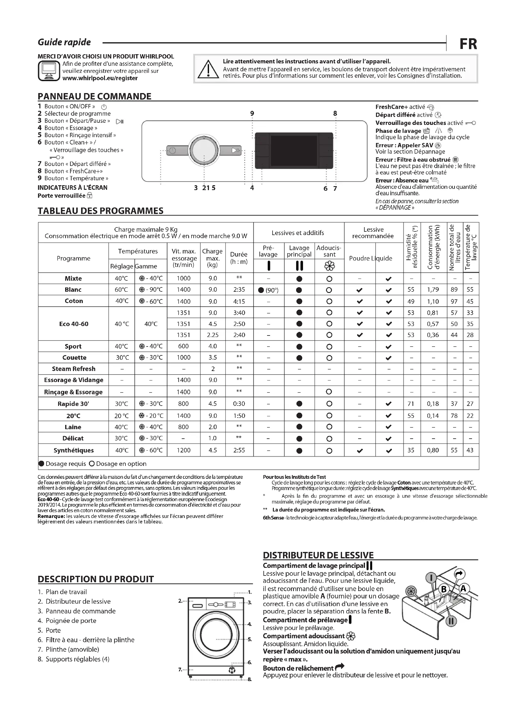 Guide rapide MERCI D’AVOIR CHOISI UN PRODUIT WHIRLPOOLAn de proter d’une assistance complète, veuillez enregistrer votre appareil sur www . whirlpool . eu/ registerLire attentivement les instructions avant d’utiliser l’appareil.Avant de mettre l’appareil en service, les boulons de transport doivent être impérativement retirés. Pour plus d’informations sur comment les enlever, voir les Consignes d’installation.