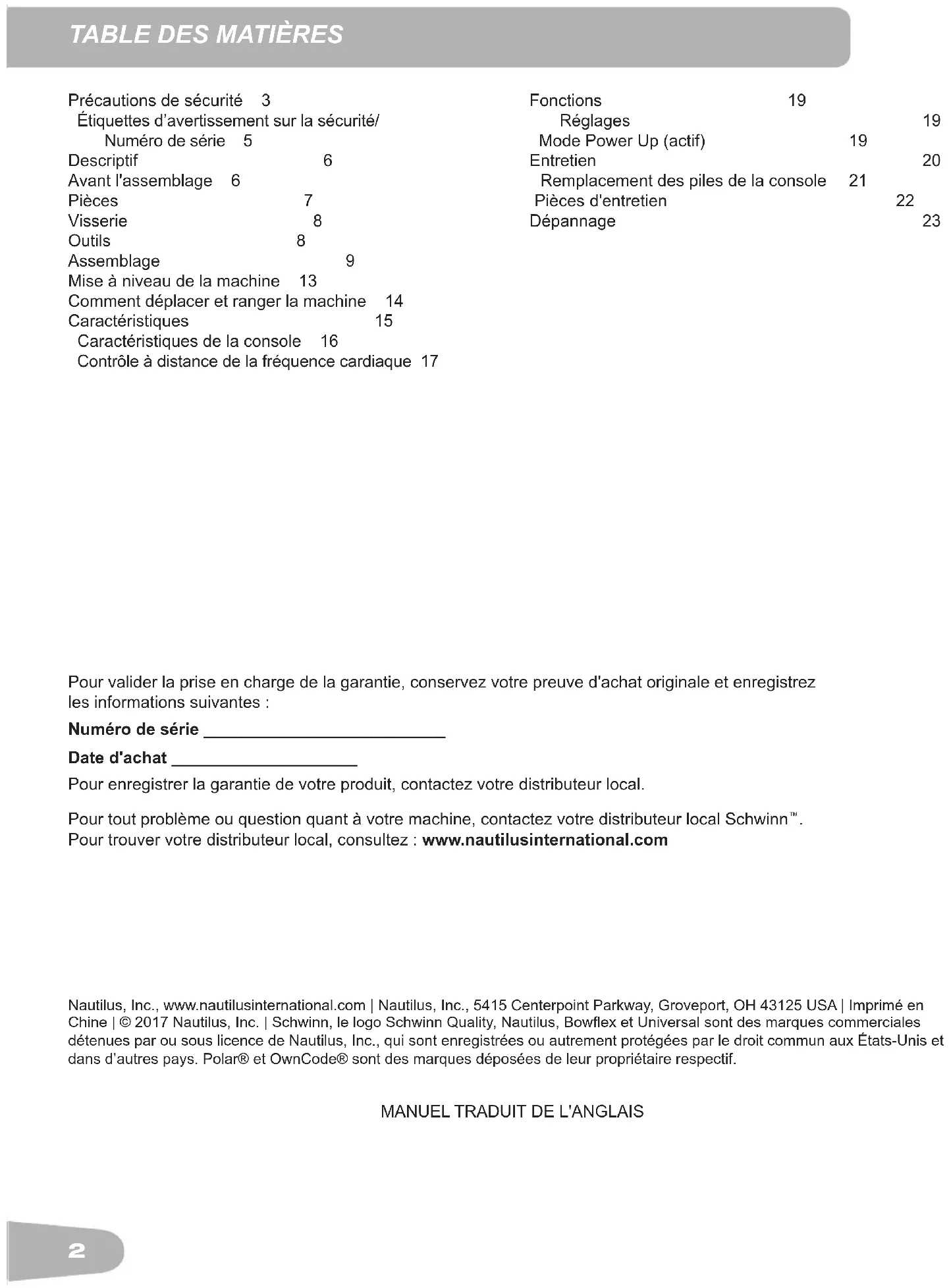 Précautions de sécurité 3 Étiquettes d’avertissement sur la sécurité/ Numéro de série 5 Descriptif 6 Avant l'assemblage 6 Pièces 7 Visserie 8 Outils 8 Assemblage 9 Mise à niveau de la machine 13 Comment déplacer et ranger la machine 14 Caractéristiques 15 Caractéristiques de la console 16 Contrôle à distance de la fréquence cardiaque 17 Fonctions 19 Réglages 19 Mode Power Up (actif) 19 Entretien 20 Remplacement des piles de la console 21 Pièces d'entretien 22 Dépannage 23 Nautilus, Inc., www.nautilusinternational.com | Nautilus, Inc., 5415 Centerpoint Parkway, Groveport, OH 43125 USA | Imprimé en Chine | © 2017 Nautilus, Inc. | Schwinn, le logo Schwinn Quality, Nautilus, Bowex et Universal sont des marques commerciales détenues par ou sous licence de Nautilus, Inc., qui sont enregistrées ou autrement protégées par le droit commun aux États-Unis et dans d’autres pays. Polar® et OwnCode® sont des marques déposées de leur propriétaire respectif.