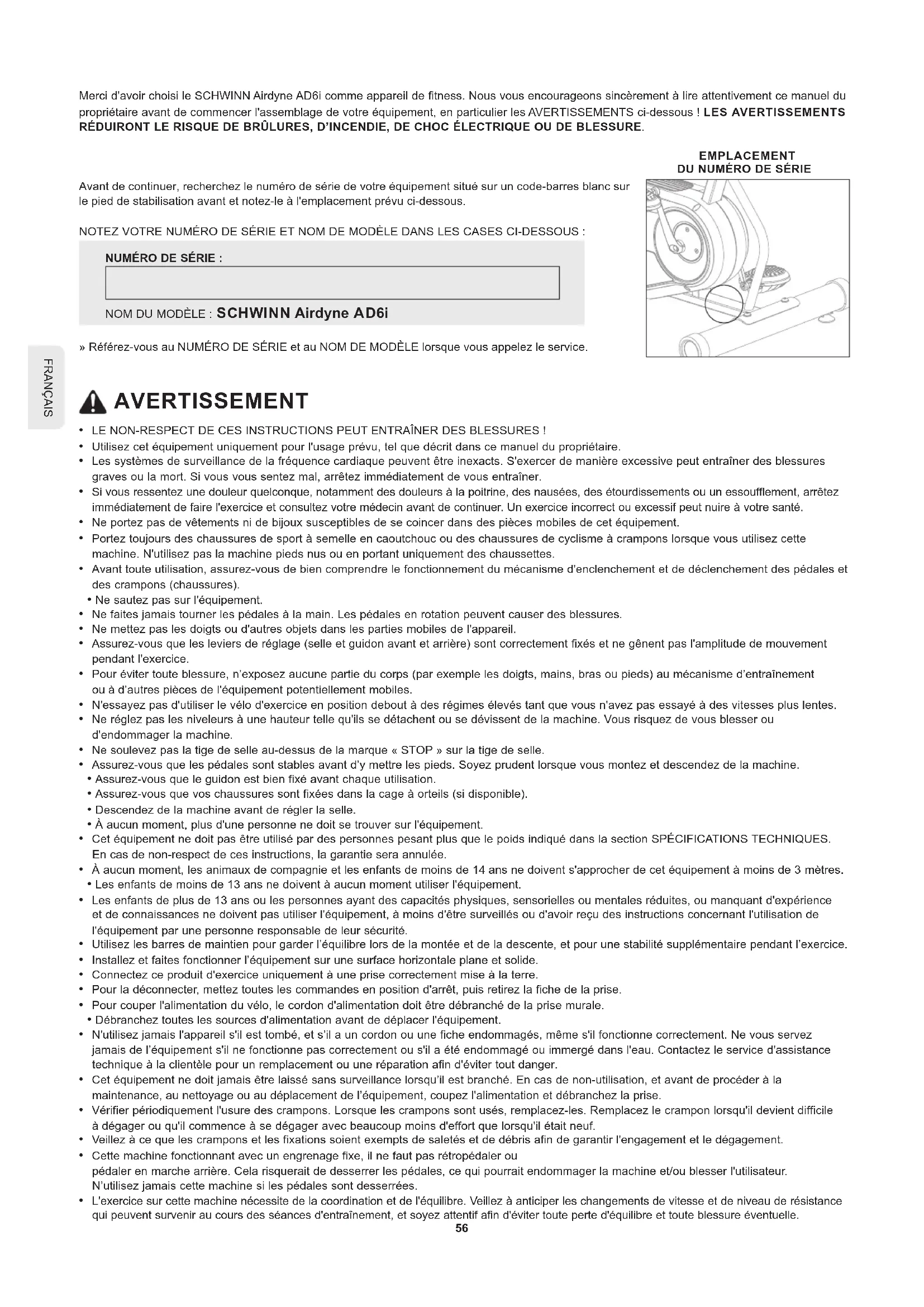 Merci d'avoir choisi le SCHWINN Airdyne AD6i comme appareil de fitness. Nous vous encourageons sincerement à dire attentivement ce manuel du proprieteaire avant de commencer l'assemblage de votre équipement, en particulier les AVERTISSEMENTS ci-dessous! LES AVERTISSEMENTS RÉDUIRONT LE RISQUE DE BRULURES, D'INCENDIE, DE CHOC ÉLECTRIQUE OU DE BLESSURE.