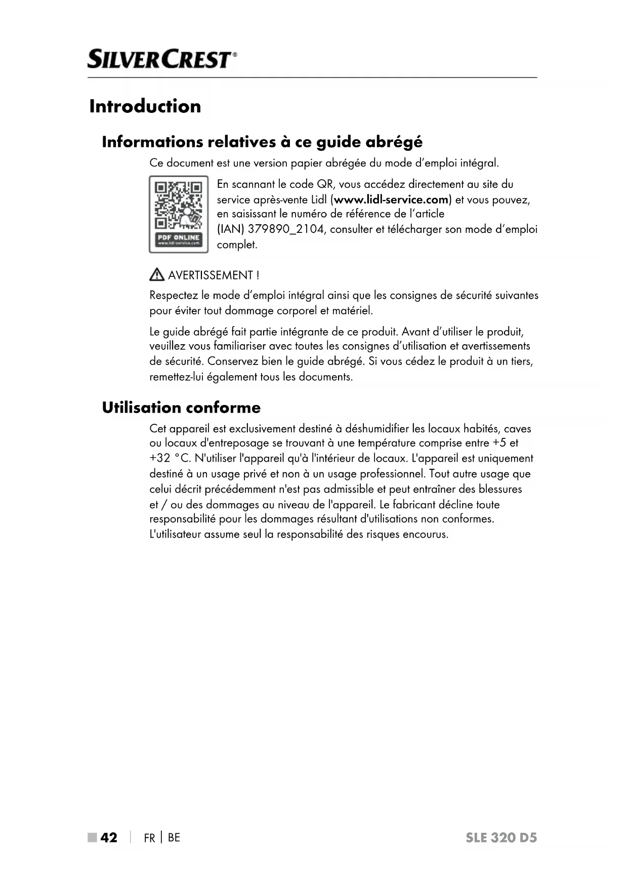 SLE 320 D5 Introduction Informations relatives à ce guide abrégé Ce document est une version papier abrégée du mode d’emploi intégral. En scannant le code QR, vous accédez directement au site du service après-vente Lidl (www.lidl-service.com) et vous pouvez, en saisissant le numéro de référence de l‘article (IAN) 379890_2104, consulter et télécharger son mode d‘emploi complet. AVERTISSEMENT ! Respectez le mode d’emploi intégral ainsi que les consignes de sécurité suivantes pour éviter tout dommage corporel et matériel. Le guide abrégé fait partie intégrante de ce produit. Avant d’utiliser le produit, veuillez vous familiariser avec toutes les consignes d’utilisation et avertissements de sécurité. Conservez bien le guide abrégé. Si vous cédez le produit à un tiers, remettez-lui également tous les documents. Utilisation conforme Cet appareil est exclusivement destiné à déshumidifier les locaux habités, caves ou locaux d'entreposage se trouvant à une température comprise entre +5 et +32°C. N'utiliser l'appareil qu'à l'intérieur de locaux. L'appareil est uniquement destiné à un usage privé et non à un usage professionnel. Tout autre usage que celui décrit précédemment n'est pas admissible et peut entraîner des blessures et / ou des dommages au niveau de l'appareil. Le fabricant décline toute responsabilité pour les dommages résultant d'utilisations non conformes. L'utilisateur assume seul la responsabilité des risques encourus.FR