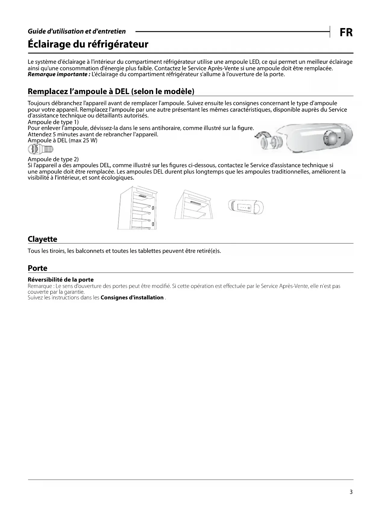 Guide d'utilisation et d'entretien Éclairage du réfrigérateur Le système d'éclairage à l'intérieur du compartiment réfrigérateur utilise une ampoule LED, ce qui permet un meilleur éclairage ainsi qu'une consommation d'énergie plus faible. Contactez le Service Après-Vente si une ampoule doit être remplacée. Remarque importante : L'éclairage du compartiment réfrigérateur s'allume à l'ouverture de la porte. Remplacez l’ampoule à DEL (selon le modèle) Toujours débranchez l'appareil avant de remplacer l'ampoule. Suivez ensuite les consignes concernant le type d'ampoule pour votre appareil. Remplacez l'ampoule par une autre présentant les mêmes caractéristiques, disponible auprès du Service d'assistance technique ou détaillants autorisés. Ampoule de type 1) Pour enlever l'ampoule, dévissez-la dans le sens antihoraire, comme illustré sur la gure. Attendez 5 minutes avant de rebrancher l'appareil. Ampoule à DEL (max 25W) Ampoule de type 2) Si l'appareil a des ampoules DEL, comme illustré sur les gures ci-dessous, contactez le Service d'assistance technique si une ampoule doit être remplacée. Les ampoules DEL durent plus longtemps que les ampoules traditionnelles, améliorent la visibilité à l'intérieur, et sont écologiques. Clayette Tous les tiroirs, les balconnets et toutes les tablettes peuvent être retiré(e)s. Porte Réversibilité de la porte Remarque : Le sens d'ouverture des portes peut être modifié. Si cette opération est effectuée par le Service Après-Vente, elle n'est pas couverte par la garantie.Suivez les instructions dans les Consignes d'installation .4 Guide d'utilisation et d'entretien Comment utiliser l'appareil Première utilisation Attendre au moins deux heures après l’installation avant de brancher l’appareil à l’alimentation électrique. Brancher le four à l’alimentation électrique démarre le fonctionnement automatiquement. Les températures idéales de stockage des aliments sont préréglées en usine. Après avoir allumé l’appareil, vous devez patienter de 4 à 6 heures pour atteindre la température de conservation appropriée pour un appareil normalement rempli. Selon le modèle, placez le ltre anti-odeurs et antibactérien dans le ventilateur comme illustré sur l’emballage du ltre. Si le signal sonore retentit, cela signie que l’alarme de température est intervenue: appuyez sur le bouton pour éteindre les alarmes sonores. Compartiment du réfrigérateur et conservation des aliments Le compartiment réfrigérateur permet la conservation d'aliments frais et de boissons. Le compartiment réfrigérateur au complet se dégivre automatiquement. La présence occasionnelle de gouttes d'eau sur la paroi arrière interne du compartiment est un signe que le dégivrage automatique fonctionne. L'eau de dégivrage est acheminée jusqu'au drain où elle est récupérée dans un récipient avant de s'évaporer. Remarque : la température interne des deux compartiments est influencée par la température ambiante, la fréquence d’ouverture des portes, et l’endroit où l’appareil est situé. Réglez les températures en fonction de ces facteurs. dans des conditions très humides, de la condensation peut se former dans le compartiment réfrigérateur, surtout sur les tablettes en verre. Dans ce cas, il est conseillé de fermer les récipients contenant du liquide (par ex. une casserole remplie de bouillon), emballez les aliments avec une teneur en eau élevée (par ex. les légumes) et activez le ventilateur, s'il y en a un. Tous les tiroirs, les balconnets et toutes les tablettes peuvent être retiré(e)s. Aération L'air de ventilation permet une meilleure distribution de la température à l'intérieur des compartiments et, par conséquent, une meilleure conservation des aliments et une diminution du taux d'humidité. N'obstruez pas la zone d'aération. Comment conserver des aliments frais et des boissons Les aliments qui produisent une grande quantité de gaz éthylène (pommes, abricots, pêches, avocats, gues, prunes, bleuets, melons, fèves) et ceux qui ne réagissent pas bien à ce gaz (fruits, légumes, salades) devraient toujours être séparés ou emballés pour ne pas réduire leur durée de conservation ; par exemple, n'entreposez pas les tomates avec les kiwis ou les choux. An de permettre une circulation d'air susante, ne placez pas les aliments trop près les uns des autres. Utilisez des récipients en plastique, en métal, en aluminium, et en verre recyclable, et une pellicule autocollante pour envelopper les aliments. Pour la conservation d'une petite quantité d'aliments dans le réfrigérateur, nous vous conseillons d'utiliser les clayettes situées au-dessus du bac à fruits et légumes car cette zone est la plus froide du compartiment. Utilisez toujours des récipients fermés pour les liquides et les aliments qui pourraient laisser échapper ou absorber des odeurs, ou couvrez-les. An d'éviter que les bouteilles ne tombent, vous pouvez utiliser le porte-bouteilles (disponible sur certains modèles).