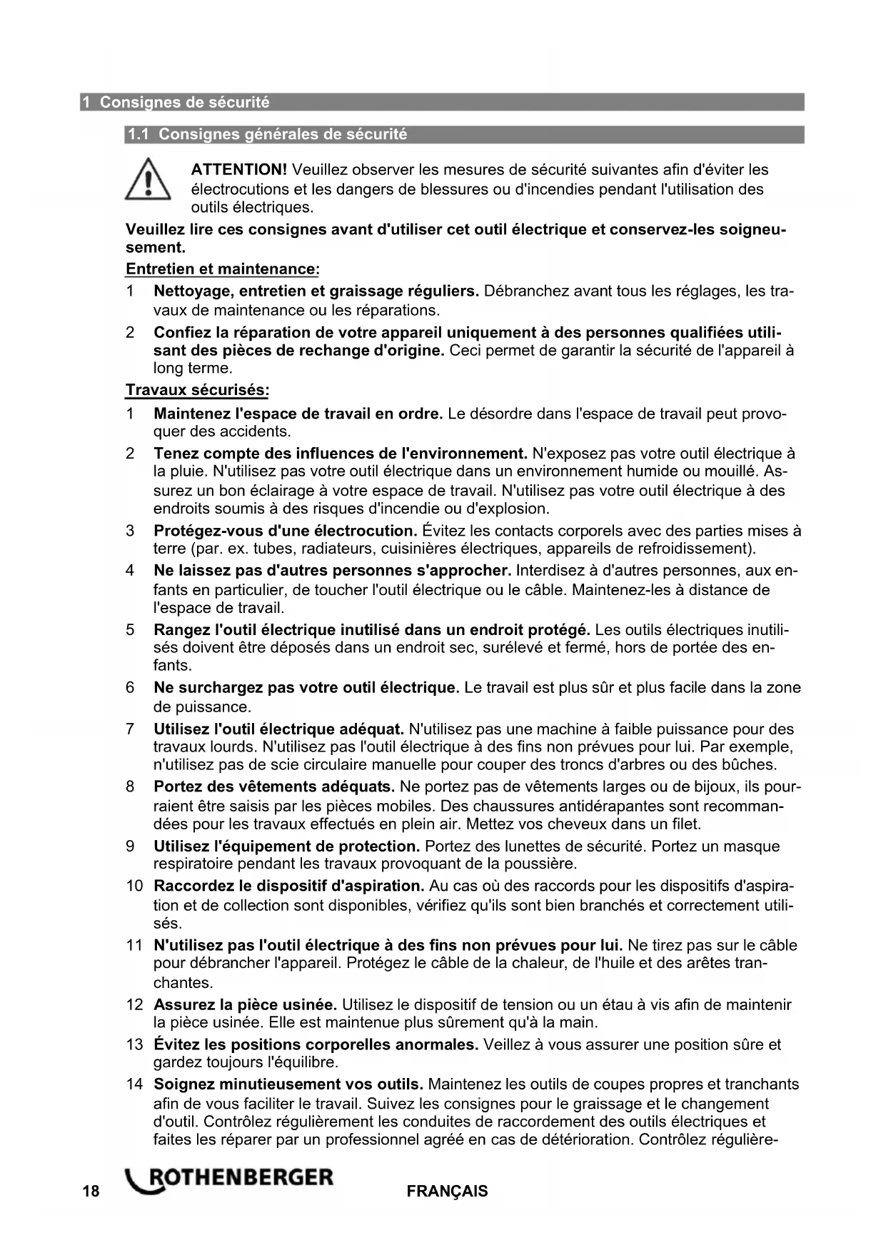 ATTENTION! Veuillez observer les mesures de sécurité suivantes afin d'éviter les électrocutions et les dangers de blessures ou d'incendies pendant l'utilisation des outils électriques. Veuillez lire ces consignes avant d'utiliser cet outil électrique et conservez-les soigneu- sement. Entretien et maintenance: 1 Nettoyage, entretien et graissage réguliers. Débranchez avant tous les réglages, les tra- vaux de maintenance ou les réparations. 2 Confiez la réparation de votre appareil uniquement à des personnes qualifiées utili- sant des pièces de rechange d'origine. Ceci permet de garantir la sécurité de l'appareil à long terme. Travaux sécurisés: 1 Maintenez l'espace de travail en ordre. Le désordre dans l'espace de travail peut provo- quer des accidents. 2 Tenez compte des influences de l'environnement. N'exposez pas votre outil électrique à la pluie. N'utilisez pas votre outil électrique dans un environnement humide ou mouillé. As- surez un bon éclairage à votre espace de travail. N'utilisez pas votre outil électrique à des endroits soumis à des risques d'incendie ou d'explosion. 3 Protégez-vous d'une électrocution. Évitez les contacts corporels avec des parties mises à terre (par. ex. tubes, radiateurs, cuisinières électriques, appareils de refroidissement). 4 Ne laissez pas d'autres personnes s'approcher. Interdisez à d'autres personnes, aux en- fants en particulier, de toucher l'outil électrique ou le câble. Maintenez-les à distance de l'espace de travail. 5 Rangez l'outil électrique inutilisé dans un endroit protégé. Les outils électriques inutili- sés doivent être déposés dans un endroit sec, surélevé et fermé, hors de portée des en- fants. 6 Ne surchargez pas votre outil électrique. Le travail est plus sûr et plus facile dans la zone de puissance. 7 Utilisez l'outil électrique adéquat. N'utilisez pas une machine à faible puissance pour des travaux lourds. N'utilisez pas l'outil électrique à des fins non prévues pour lui. Par exemple, n'utilisez pas de scie circulaire manuelle pour couper des troncs d'arbres ou des bûches. 8 Portez des vêtements adéquats. Ne portez pas de vêtements larges ou de bijoux, ils pour- raient être saisis par les pièces mobiles. Des chaussures antidérapantes sont recomman- dées pour les travaux effectués en plein air. Mettez vos cheveux dans un filet. 9 Utilisez l'équipement de protection. Portez des lunettes de sécurité. Portez un masque respiratoire pendant les travaux provoquant de la poussière. 10 Raccordez le dispositif d'aspiration. Au cas où des raccords pour les dispositifs d'aspira- tion et de collection sont disponibles, vérifiez qu'ils sont bien branchés et correctement utili- sés. 11 N'utilisez pas l'outil électrique à des fins non prévues pour lui. Ne tirez pas sur le câble pour débrancher l'appareil. Protégez le câble de la chaleur, de l'huile et des arêtes tran- chantes. 12 Assurez la pièce usinée. Utilisez le dispositif de tension ou un étau à vis afin de maintenir la pièce usinée. Elle est maintenue plus sûrement qu'à la main. 13 Évitez les positions corporelles anormales. Veillez à vous assurer une position sûre et gardez toujours l'équilibre. 14 Soignez minutieusement vos outils. Maintenez les outils de coupes propres et tranchants afin de vous faciliter le travail. Suivez les consignes pour le graissage et le changement d'outil. Contrôlez régulièrement les conduites de raccordement des outils électriques et faites les réparer par un professionnel agréé en cas de détérioration. Contrôlez régulière-FRANÇAIS 19 ment les rallonges et remplacez-les en cas de détériorations. Maintenez la poignée sèche, propre et exempte de graisse ou d'huile. 15 Retirez la fiche de la prise de courant. Lorsque vous n'utilisez pas l'outil électrique, avant l'entretien ou lors du changement d'outils comme la scie, la perceuse, la fraise. 16 Ne laissez pas la clé d'outil à l'intérieur. Vérifiez que la clé et l'outil de réglage soient reti- rés avant la mise en marche. 17 Évitez les mises en marche involontaire. Assurez-vous que l'interrupteur est éteint lors- que vous insérez la fiche dans la prise. 18 Utilisez la rallonge lors de travaux à l'extérieur. Utilisez uniquement des rallonges homo- loguées et marquées en conséquence pour les travaux à l'air libre. 19 Soyez attentif. Soyez concentré sur votre travail. Faites preuve de bon sens lorsque vous travaillez. N'utilisez aucun outil électrique si vous n'êtes pas concentré. 20 Vérifiez le bon état de l'outil électrique. Avant de continuer à utiliser l'outil électrique, véri- fiez soigneusement les dispositifs de sécurité ou les pièces légèrement endommagées et assurez-vous que le fonctionnement est impeccable et adéquat. Vérifiez que les parties mo- biles fonctionnent de manière impeccable et ne coincent pas ainsi que le parfait état des pièces. Toutes les pièces doivent être montées correctement et remplir toutes les conditions afin de garantir un fonctionnement impeccable de l'outil électrique. Les pièces et les dispositifs de sécurité endommagés doivent être réparés ou changés par un atelier agréé, à moins que le mode d'emploi donne d'autres consignes. Les interrupteurs endommagés doivent être remplacés dans un atelier pour notre clientèle. N'utilisez pas un outil électrique qui ne peut être mis en marche ou arrêté. 21 Attention. L'utilisation d'autres outils et accessoires peut provoquer des blessures. 22 Faites réparer les outils électriques par un électricien qualifié. Cet outil électrique cor- respond aux dispositions de sécurités applicables. Les réparations doivent uniquement être effectuées par un électricien qualifié et avec les pièces de rechange originales ; dans le cas contraire, cela pourrait provoquer des accidents.