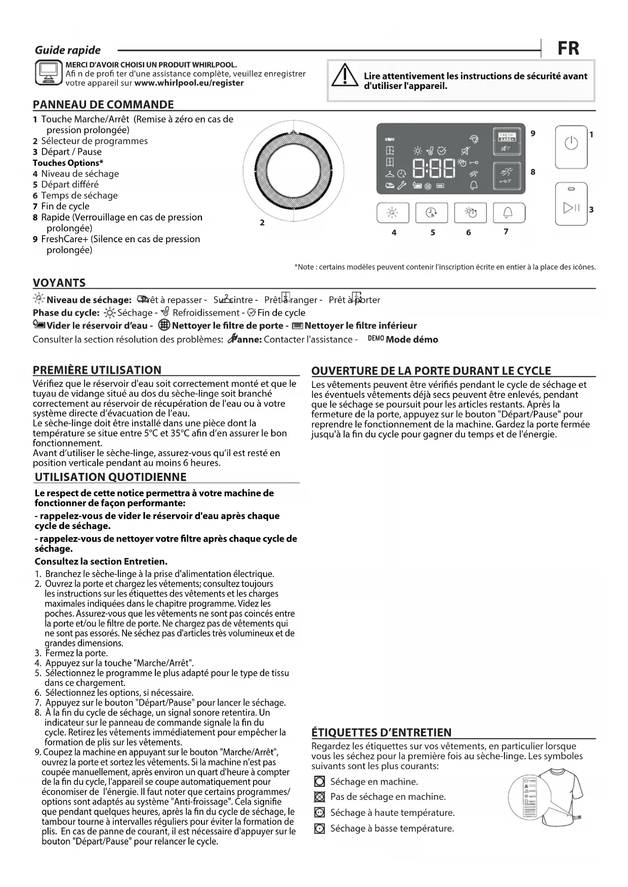 1 Touche Marche/Arrêt (Remise à zéro en cas de pression prolongée) 2 Sélecteur de programmes 3 Départ / Pause Touches Options* 4 Niveau de séchage 5 Départ diéré 6 Temps de séchage 7 Fin de cycle 8 Rapide (Verrouillage en cas de pression prolongée) 9 FreshCare+ (Silence en cas de pression prolongée) *Note : certains modèles peuvent contenir l’inscription écrite en entier à la place des icônes. VOYANTS Niveau de séchage: Prêt à repasser - Sur cintre - Prêt à ranger - Prêt à porter Phase du cycle: Séchage - Refroidissement - Fin de cycle Vider le réservoir d’eau - Nettoyer le ltre de porte - Nettoyer le ltre inférieur Consulter la section résolution des problèmes: Panne: Contacter l'assistance - DEMO Mode démo
