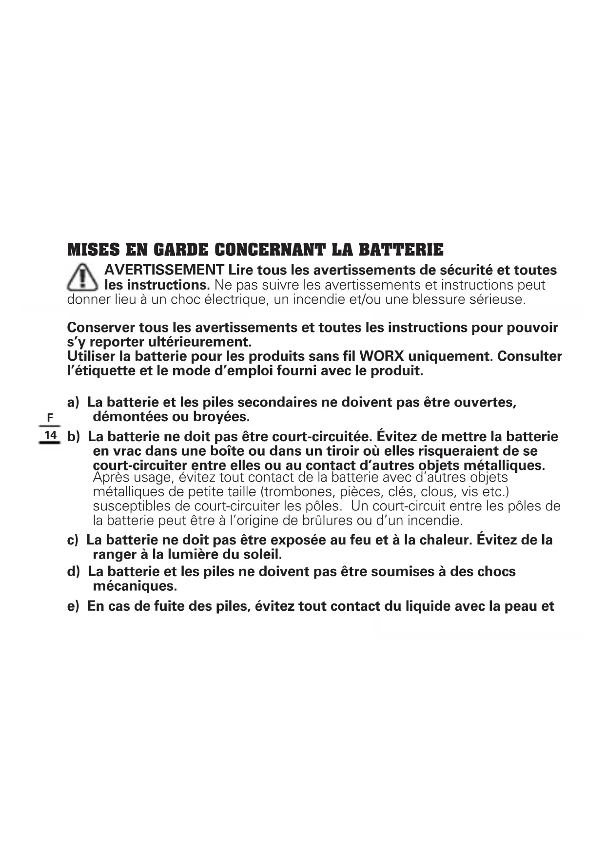AVERTISSEMENT Lire tous les avertissements de sécurité et toutes les instructions. Ne pas suivre les avertissements et instructions peut donner lieu à un choc électrique, un incendie et/ou une blessure sérieuse. Conserver tous les avertissements et toutes les instructions pour pouvoir s’y reporter ultérieurement. Utiliser la batterie pour les produits sans fil WORX uniquement. Consulter l’étiquette et le mode d’emploi fourni avec le produit. a) La batterie et les piles secondaires ne doivent pas être ouvertes, démontées ou broyées. b) La batterie ne doit pas être court-circuitée. Évitez de mettre la batterie en vrac dans une boîte ou dans un tiroir où elles risqueraient de se court-circuiter entre elles ou au contact d’autres objets métalliques. Après usage, évitez tout contact de la batterie avec d’autres objets métalliques de petite taille (trombones, pièces, clés, clous, vis etc.) susceptibles de court-circuiter les pôles. Un court-circuit entre les pôles de la batterie peut être à l’origine de brûlures ou d’un incendie. c) La batterie ne doit pas être exposée au feu et à la chaleur. Évitez de la ranger à la lumière du soleil. d) La batterie et les piles ne doivent pas être soumises à des chocs mécaniques. e) En cas de fuite des piles, évitez tout contact du liquide avec la peau et15